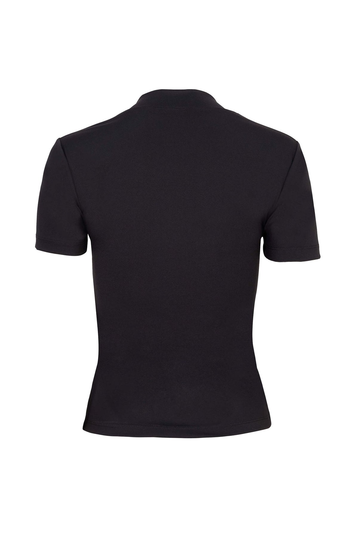 Esta blusa negra de manga corta es un esencial refinado que eleva cualquier guardarropa femenino. Su diseño minimalista con cuello redondo y silueta limpia ofrece una estética pulida y atemporal, ideal para mujeres que buscan piezas versátiles sin renunciar a la elegancia.