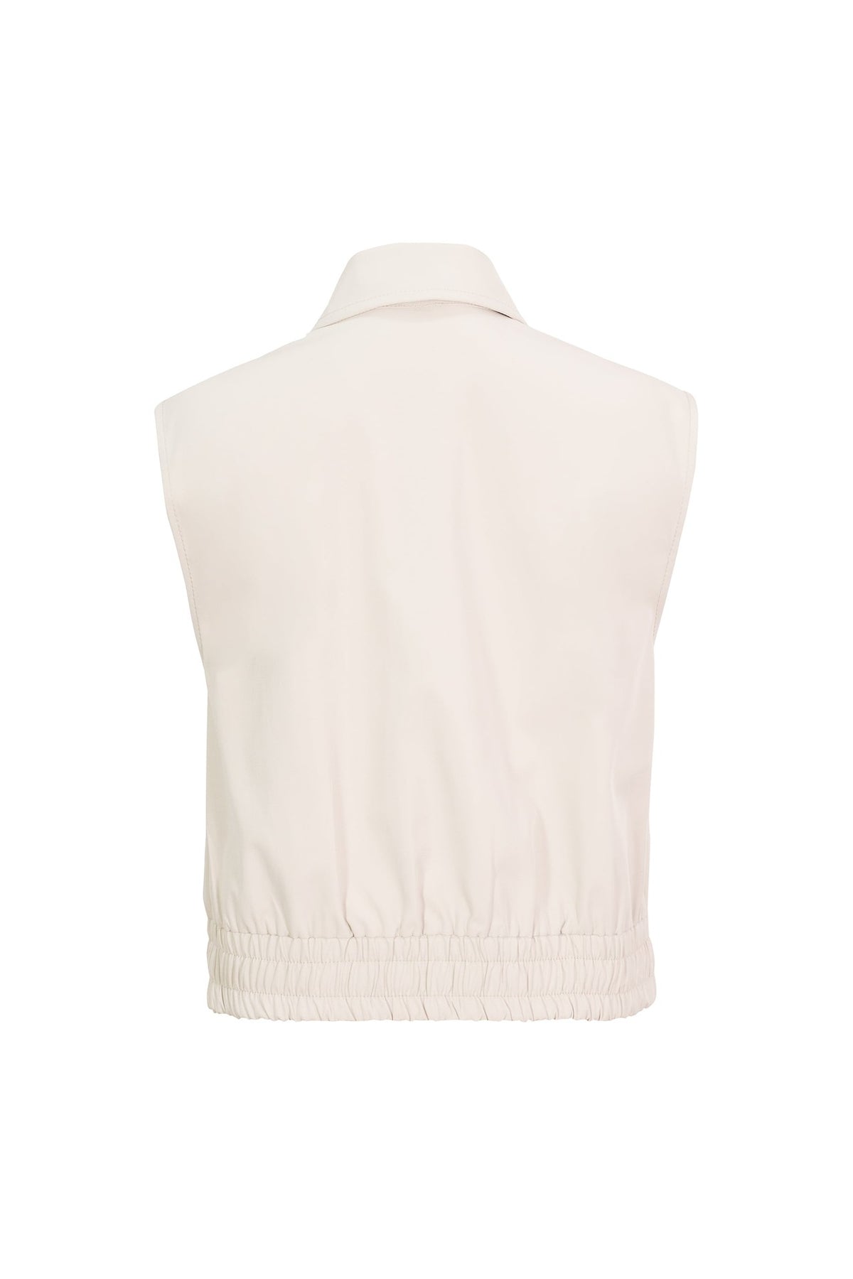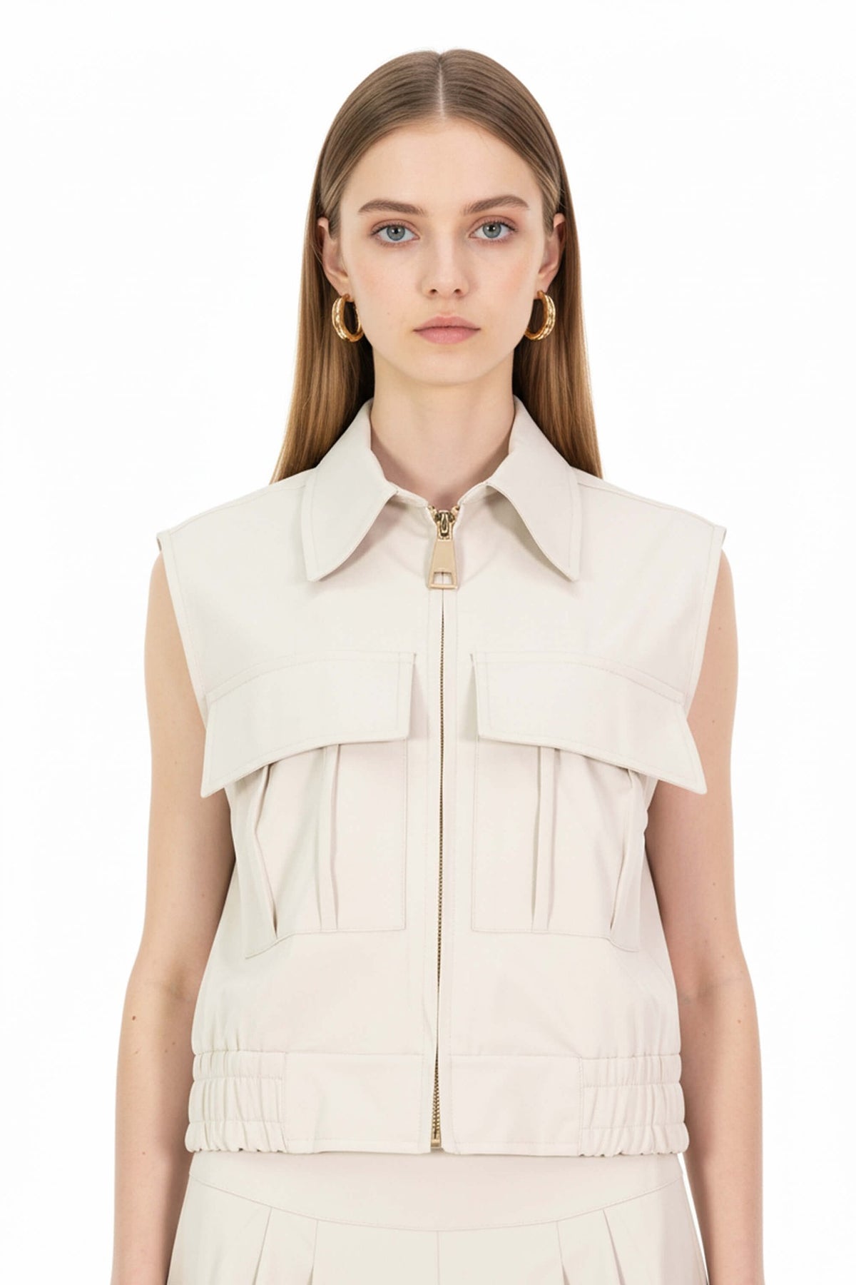 El chaleco estructurado con cierre metálico redefine la sastrería moderna femenina. Diseñado con un corte impecable y detalles arquitectónicos, combina estructura, elegancia y funcionalidad. Su cuello camisero y bolsillos amplios aportan carácter, mientras la silueta entallada resalta la figura con precisión.