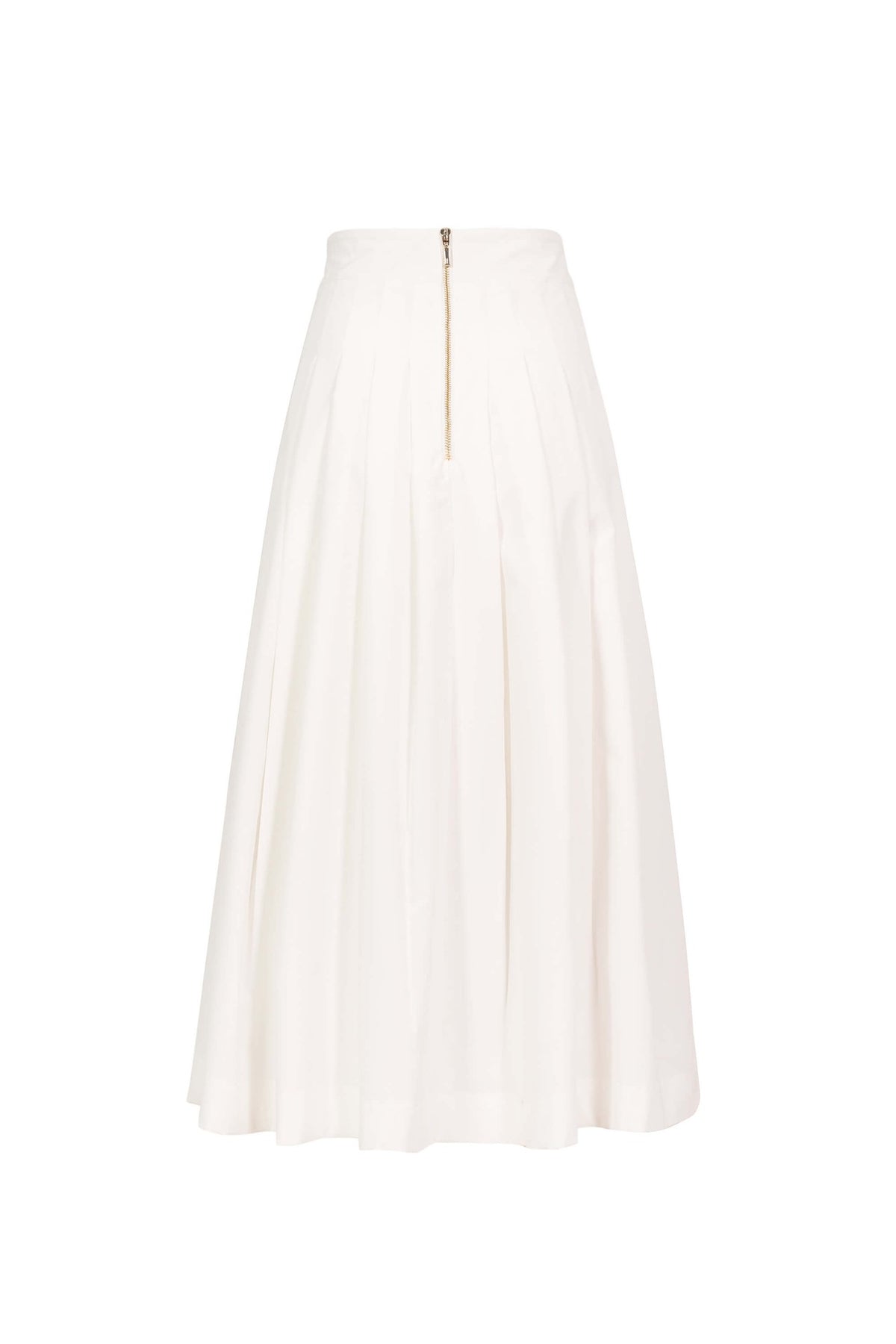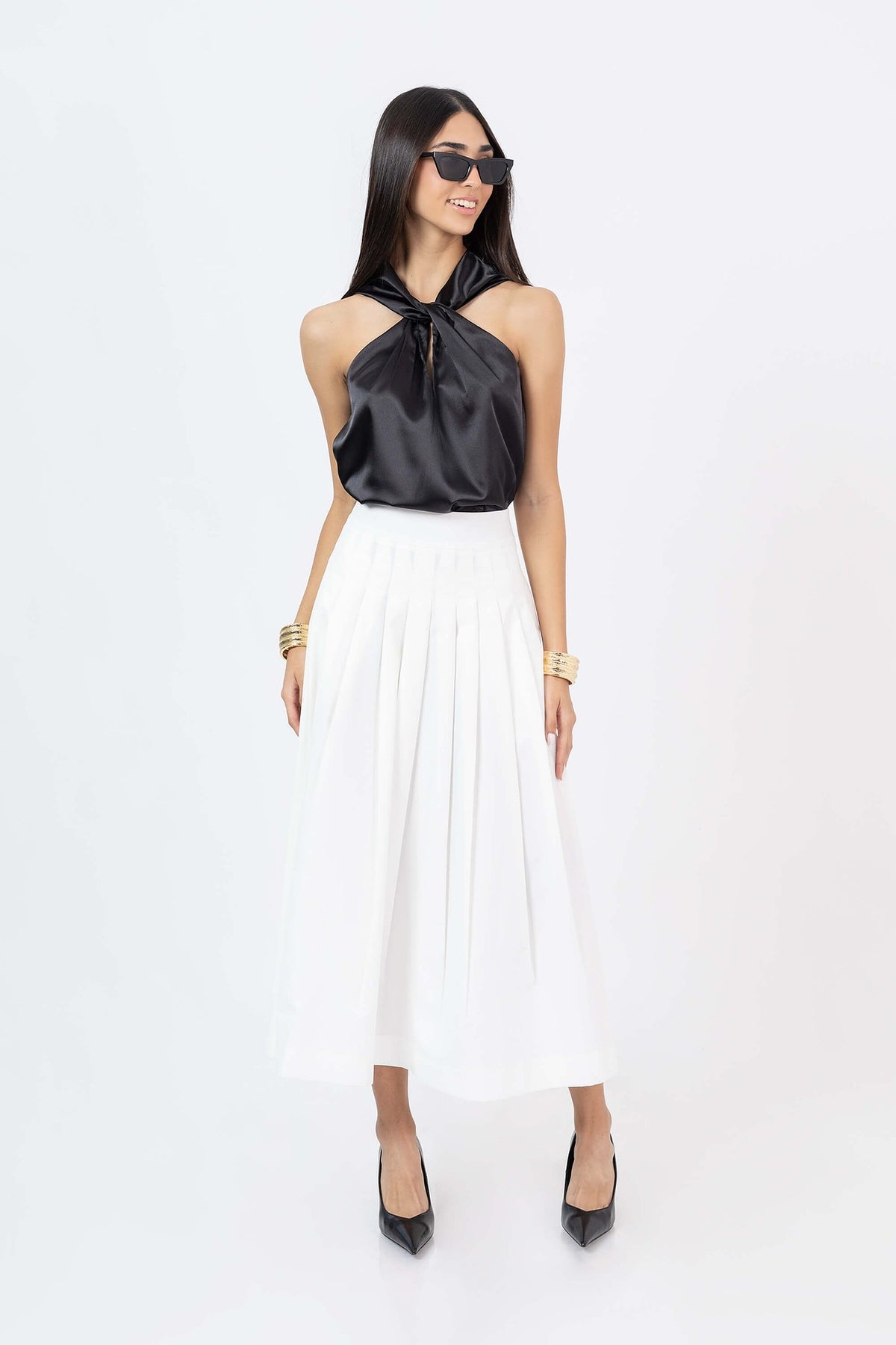 La falda midi plisada es una pieza esencial de la elegancia femenina. Su diseño de talle alto y plisado amplio genera una silueta fluida que realza el movimiento con gracia y distinción. Confeccionada en tejido de textura suave y estructura ligera, ofrece una caída impecable y sofisticada.