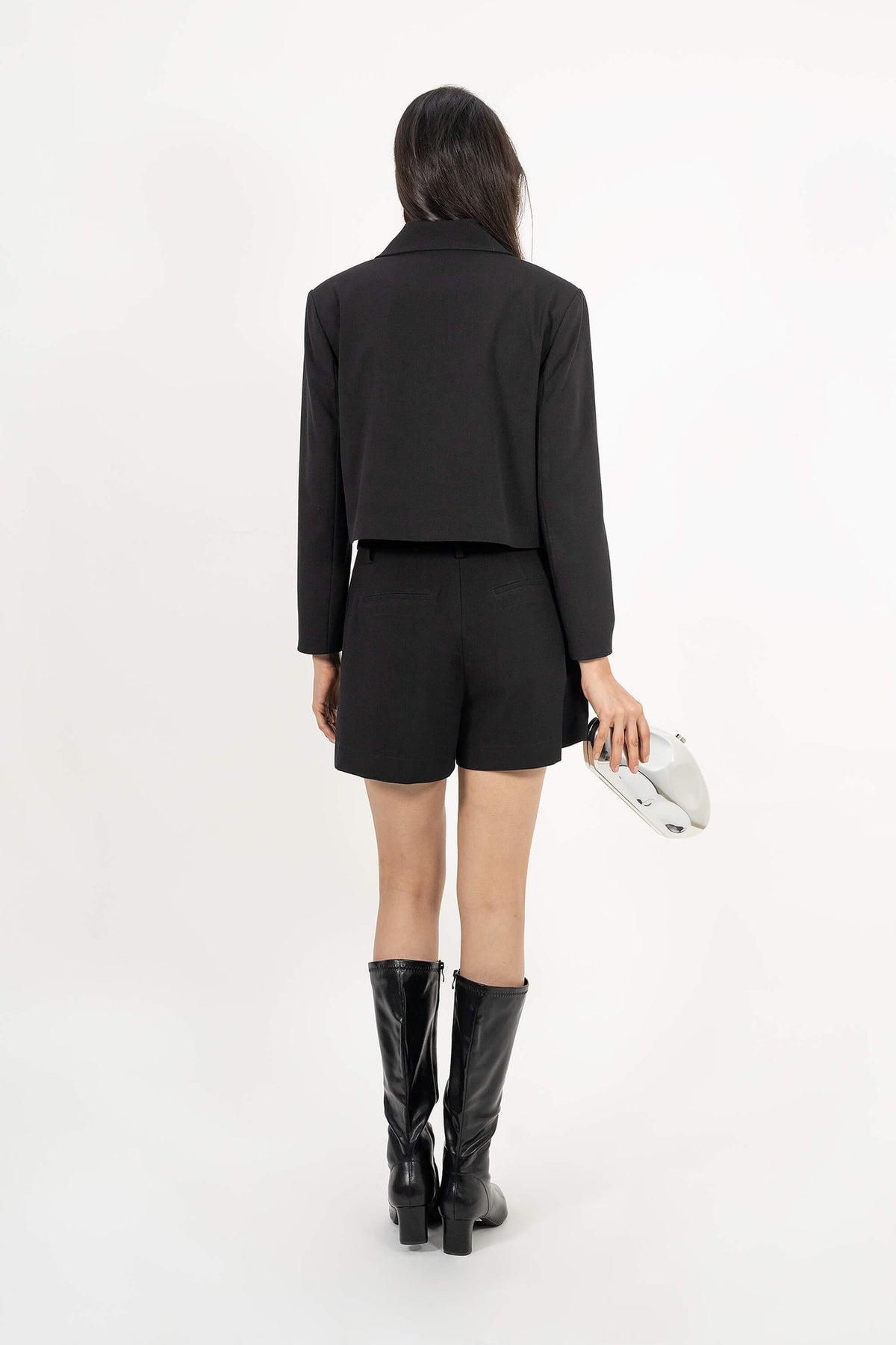El short sastre de tiro alto fusiona la elegancia del tailoring con una silueta fresca y moderna. Su diseño con pinzas frontales y pretina ancha define la cintura con precisión, logrando una figura estilizada y femenina.