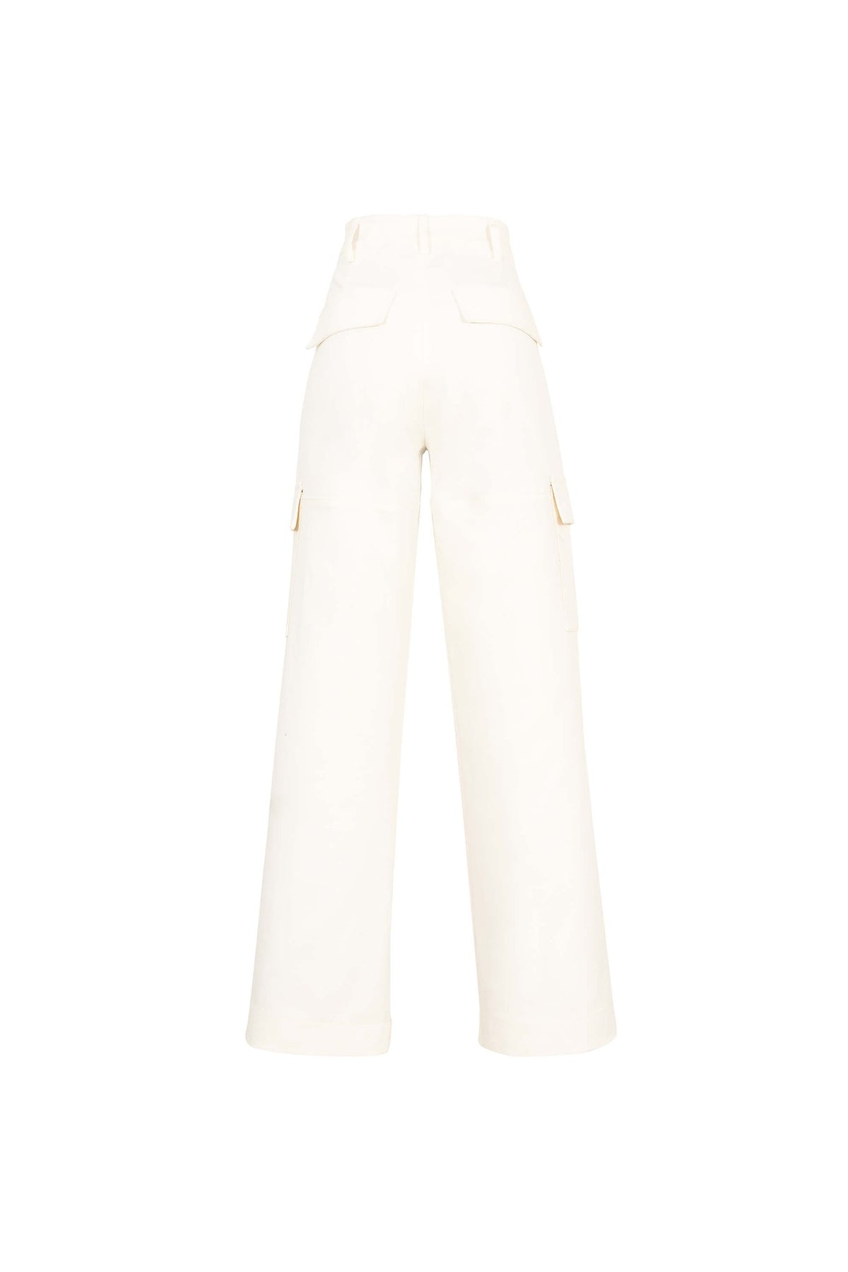 La cintura alta define la figura con sutileza, mientras que la caída recta aporta una línea estilizada y moderna. Incorpora bolsillos laterales de inspiración cargo que suman carácter y practicidad sin restar refinamiento al diseño. Su confección cuidada garantiza comodidad, estructura y libertad de movimiento, adaptándose con naturalidad a distintos contextos.