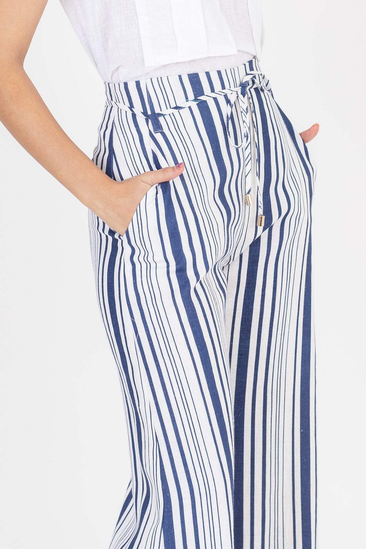 La cintura alta con ajuste cómodo define el talle y equilibra visualmente la silueta, mientras que el diseño vertical del tejido alarga ópticamente las piernas. Los bolsillos laterales añaden funcionalidad sin comprometer la estética limpia y contemporánea de la prenda.