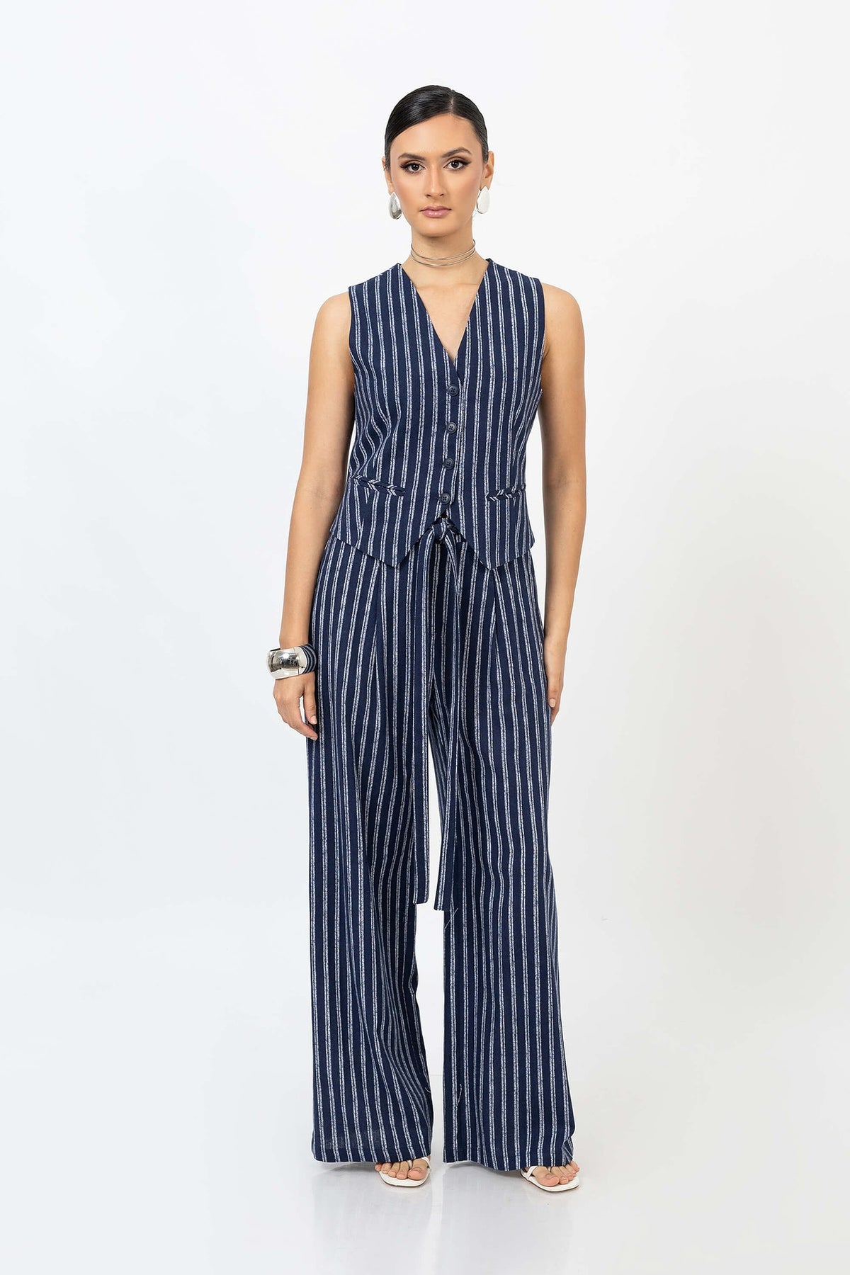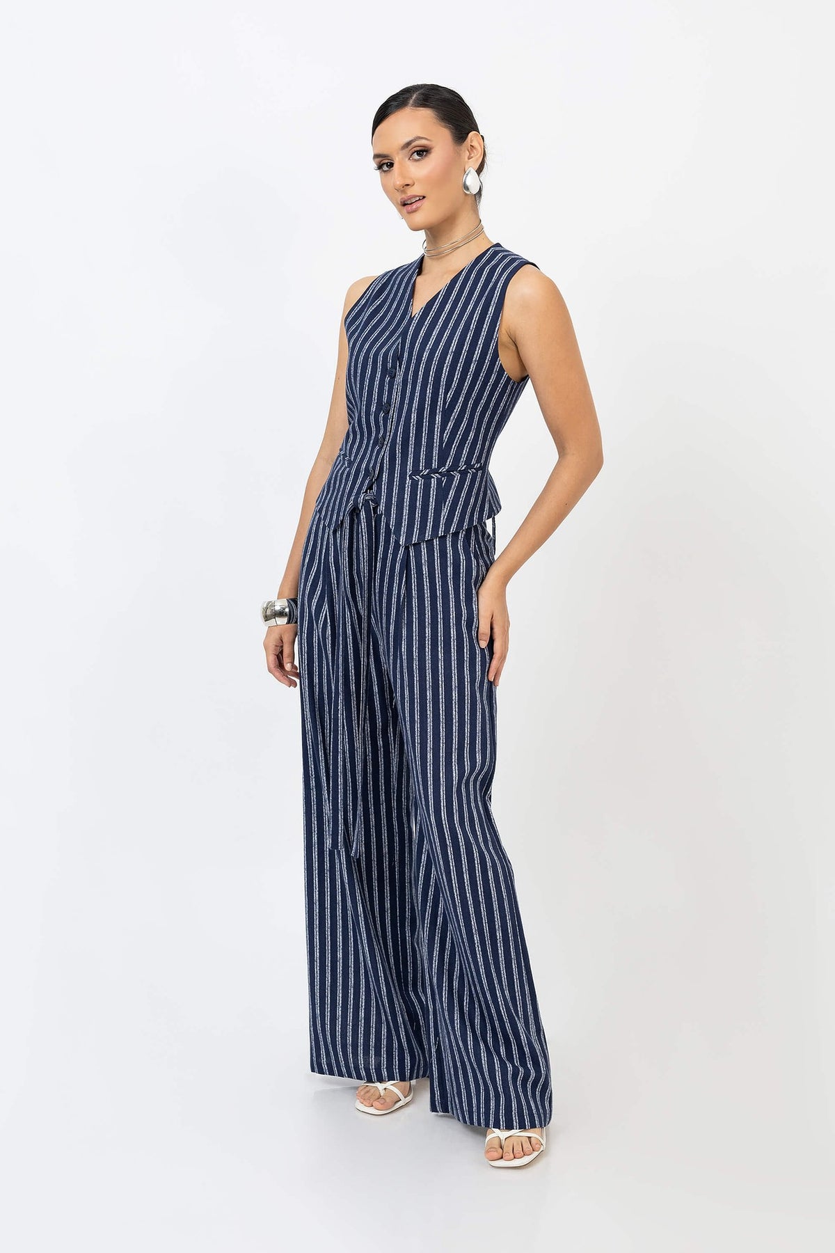 Este pantalón sastrero de pierna ancha es una pieza clave para un guardarropa contemporáneo y refinado. Su silueta amplia aporta movimiento y estructura, creando un equilibrio perfecto entre comodidad y sofisticación. El diseño vertical del tejido estiliza visualmente la figura y alarga la línea de las piernas, ofreciendo un efecto favorecedor y elegante.