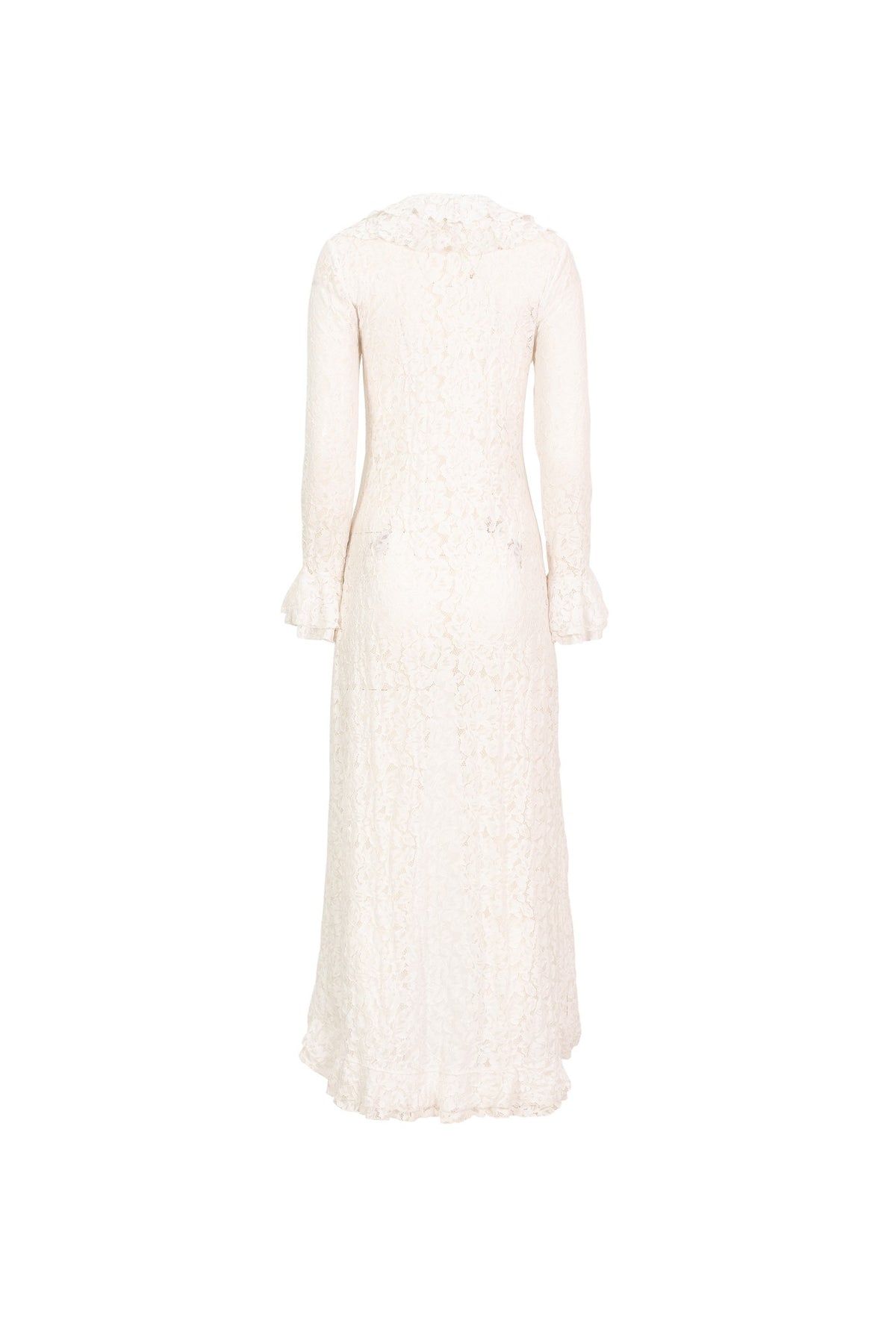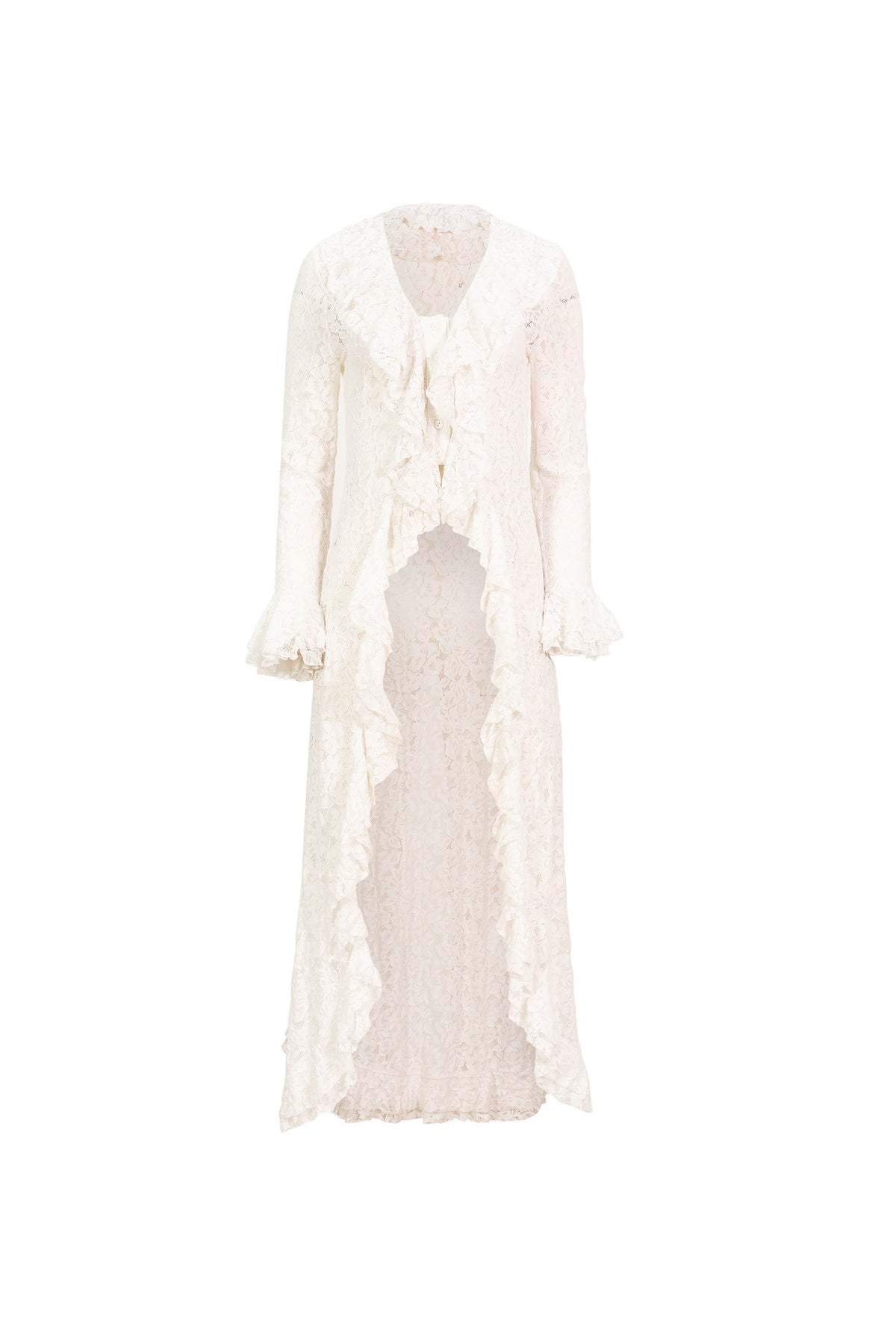 Este ensamble de encaje es una pieza exquisita que realza la feminidad con un aire romántico y vanguardista. Su silueta larga, fluida y delicadamente trabajada crea un movimiento armónico al caminar, mientras que los volantes que adornan el frente y el borde aportan un toque teatral y lleno de presencia. Las mangas con acabado acampanado refuerzan esa estética suave y sofisticada que distingue a la mujer contemporánea que busca prendas únicas, artesanales y profundamente elegantes.