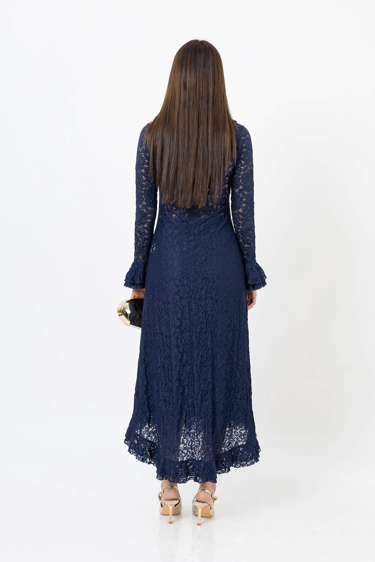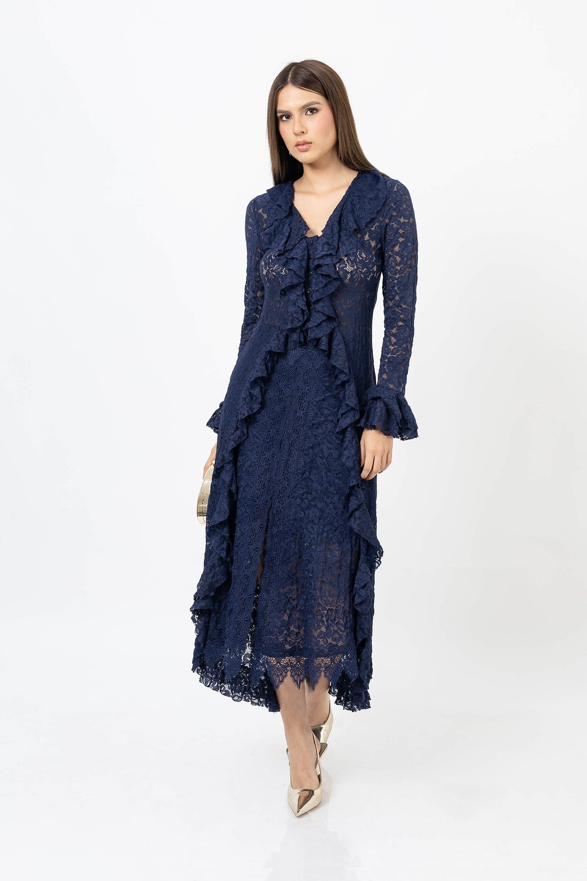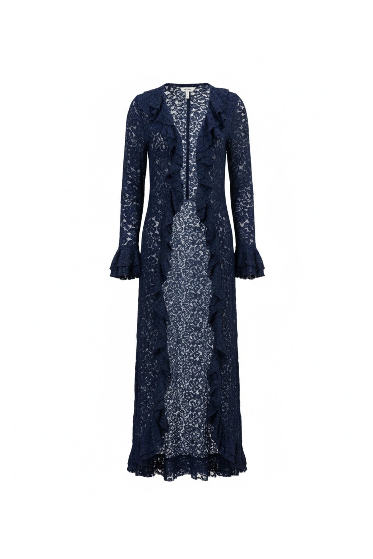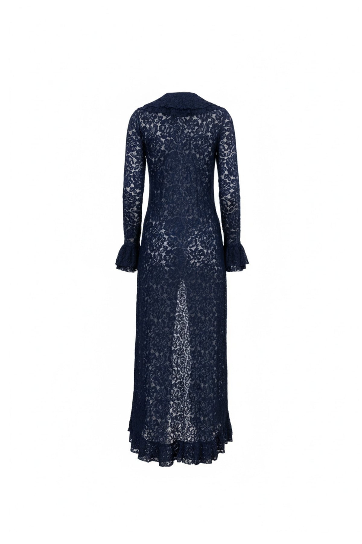 Este ensamble de encaje es una pieza exquisita que realza la feminidad con un aire romántico y vanguardista. Su silueta larga, fluida y delicadamente trabajada crea un movimiento armónico al caminar, mientras que los volantes que adornan el frente y el borde aportan un toque teatral y lleno de presencia. Las mangas con acabado acampanado refuerzan esa estética suave y sofisticada que distingue a la mujer contemporánea que busca prendas únicas, artesanales y profundamente elegantes.