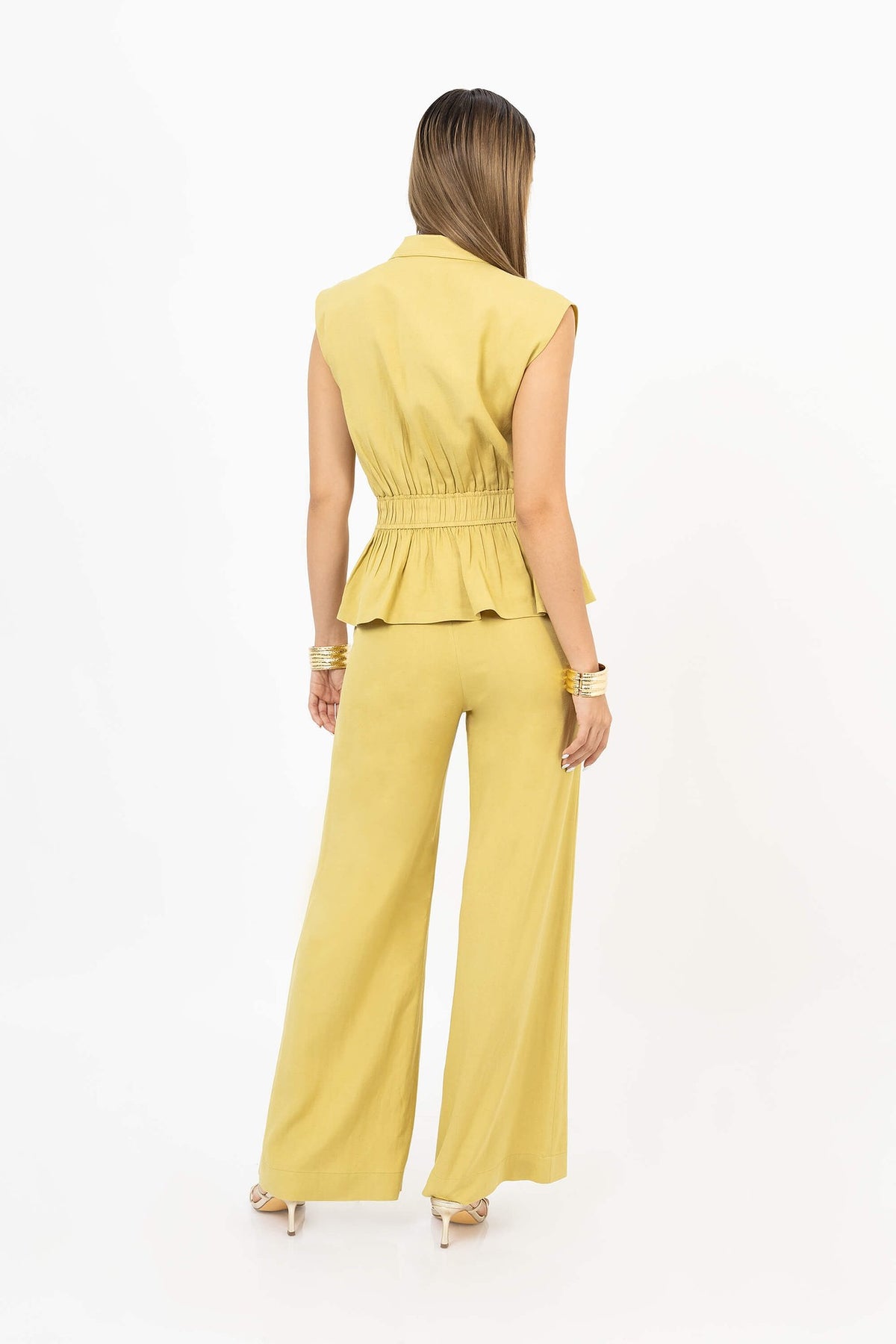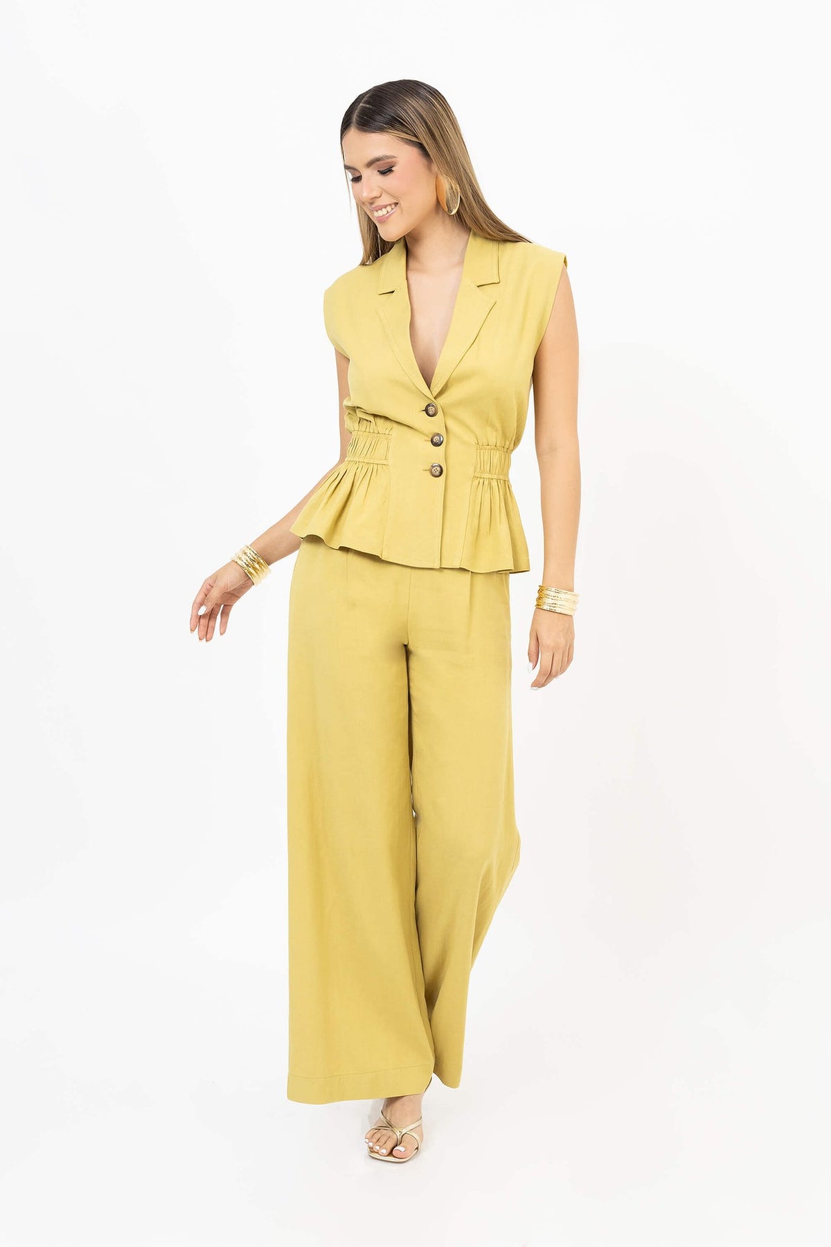 Confeccionado en una tela ligera de caída fluida, ofrece una sensación fresca y refinada, ideal para climas cálidos o transiciones de temporada. El tono amarillo suave ilumina el look y aporta un aire moderno y seguro, perfecto para mujeres que buscan destacar con elegancia.
