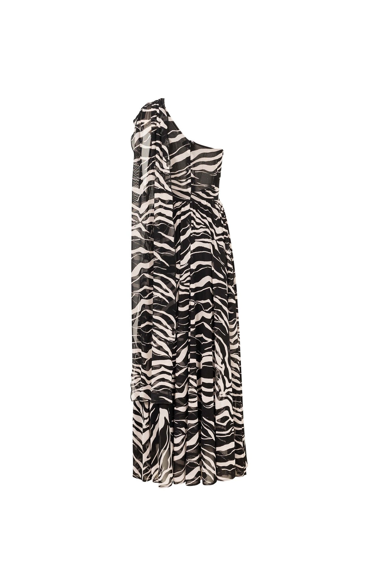 El estampado gráfico de inspiración orgánica añade profundidad visual y un aire artístico que distingue a la prenda dentro del guardarropa de lujo. El lazo integrado en el hombro no solo aporta dramatismo, sino que enmarca el diseño con una feminidad audaz y refinada.