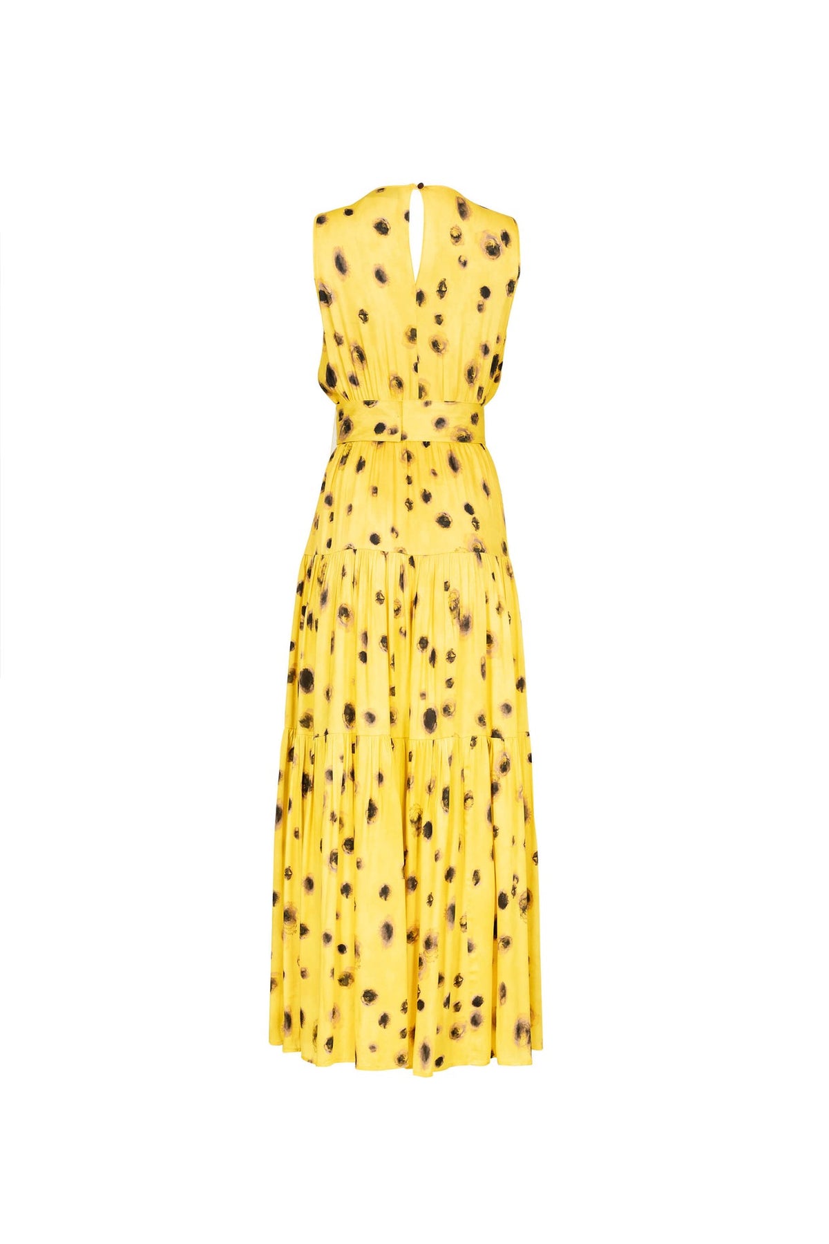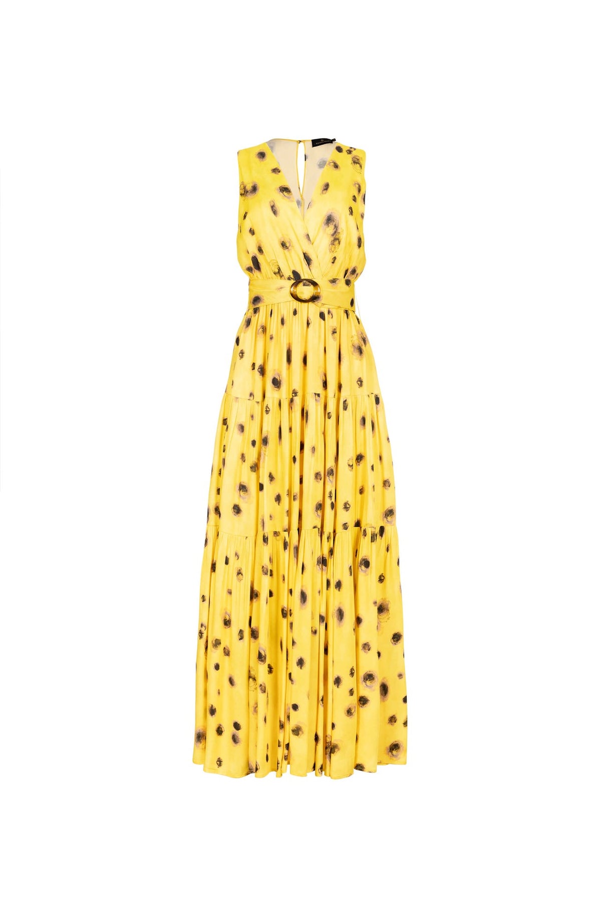Este vestido largo amarillo estampado es una declaración de elegancia luminosa y feminidad contemporánea. Su diseño sin mangas con escote en V estiliza el torso de manera natural, mientras que la cintura definida con cinturón integrado realza la silueta con equilibrio y sutileza.