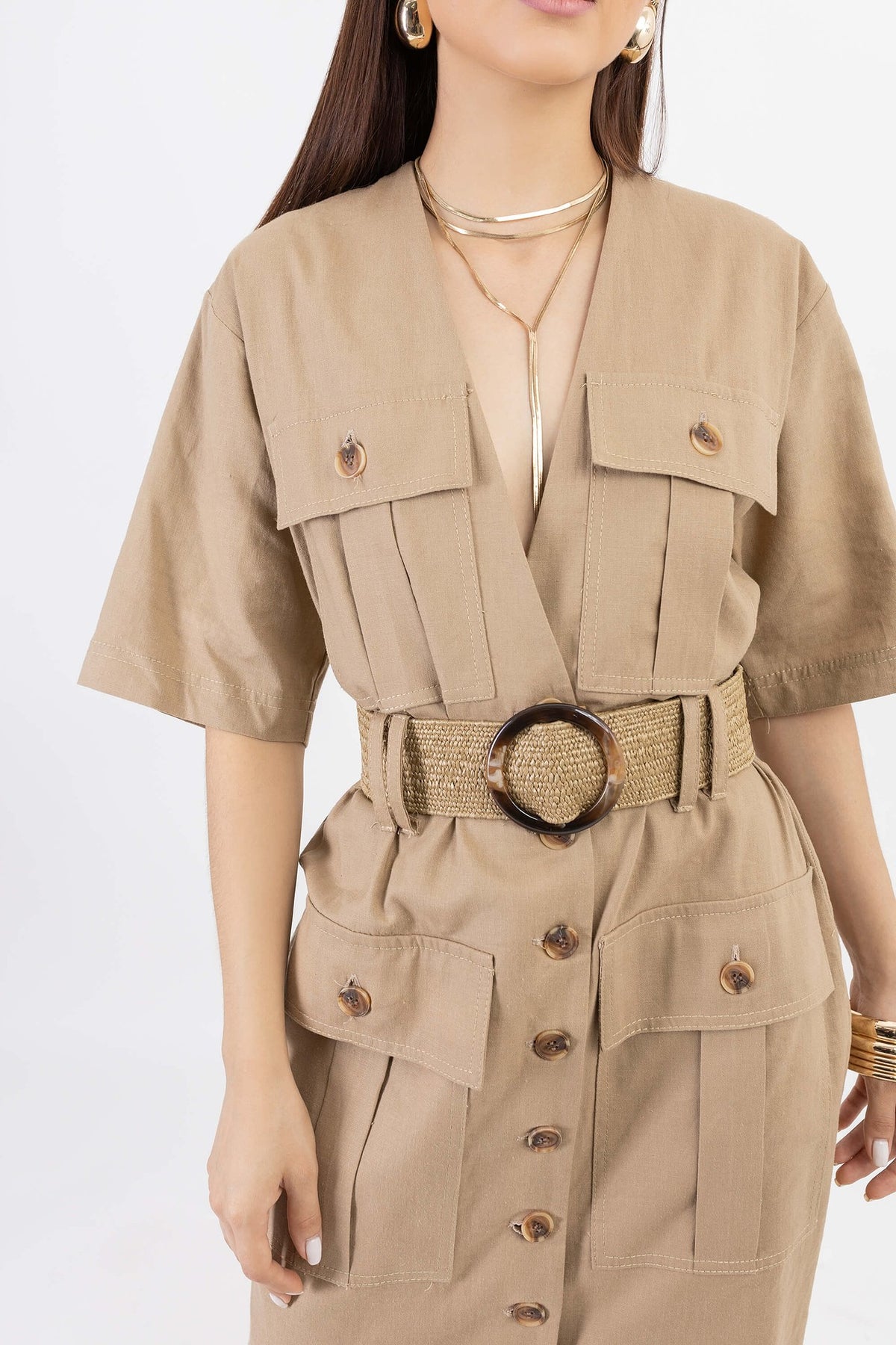 Este vestido midi beige de inspiración safari es una pieza sofisticada que equilibra estructura, feminidad y funcionalidad. Su diseño presenta un escote en V sutil, mangas cortas de caída limpia y bolsillos frontales que aportan carácter contemporáneo sin perder refinamiento.