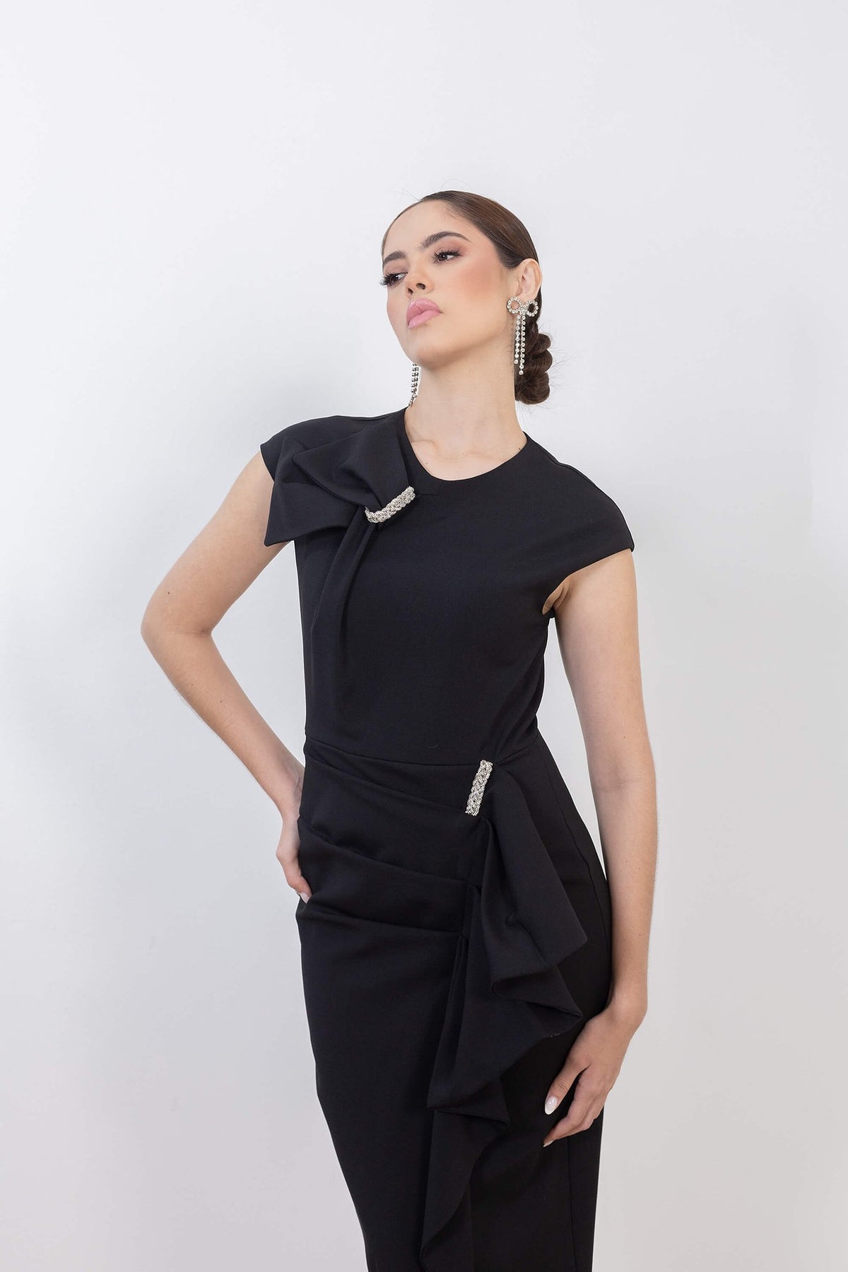 Los broches tipo joya colocados estratégicamente elevan la prenda, añadiendo un destello discreto que transforma este vestido en una opción ideal para ocasiones especiales, eventos nocturnos o cenas formales. El cuello cerrado y las mangas cortas equilibran el diseño, logrando una estética refinada, moderna y atemporal.