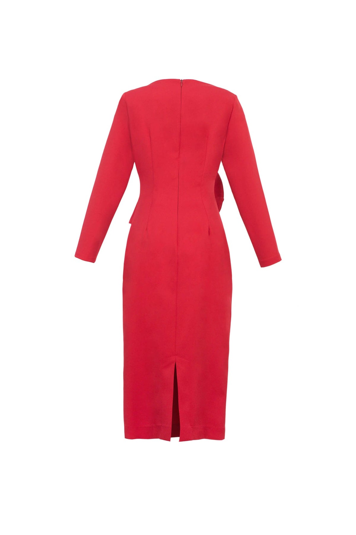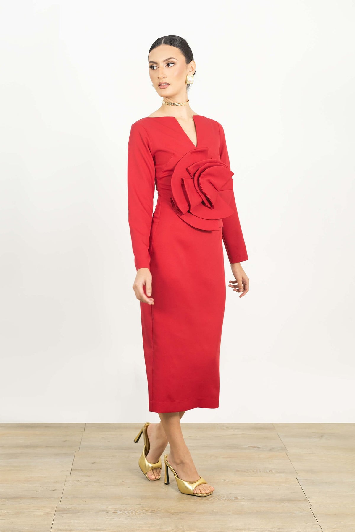 Este vestido midi rojo es una declaración de elegancia poderosa y sofisticación contemporánea. Su diseño de líneas limpias se transforma en una pieza icónica gracias al detalle floral estructural al frente, inspirado en la alta costura y concebido para realzar la silueta con carácter y feminidad.
