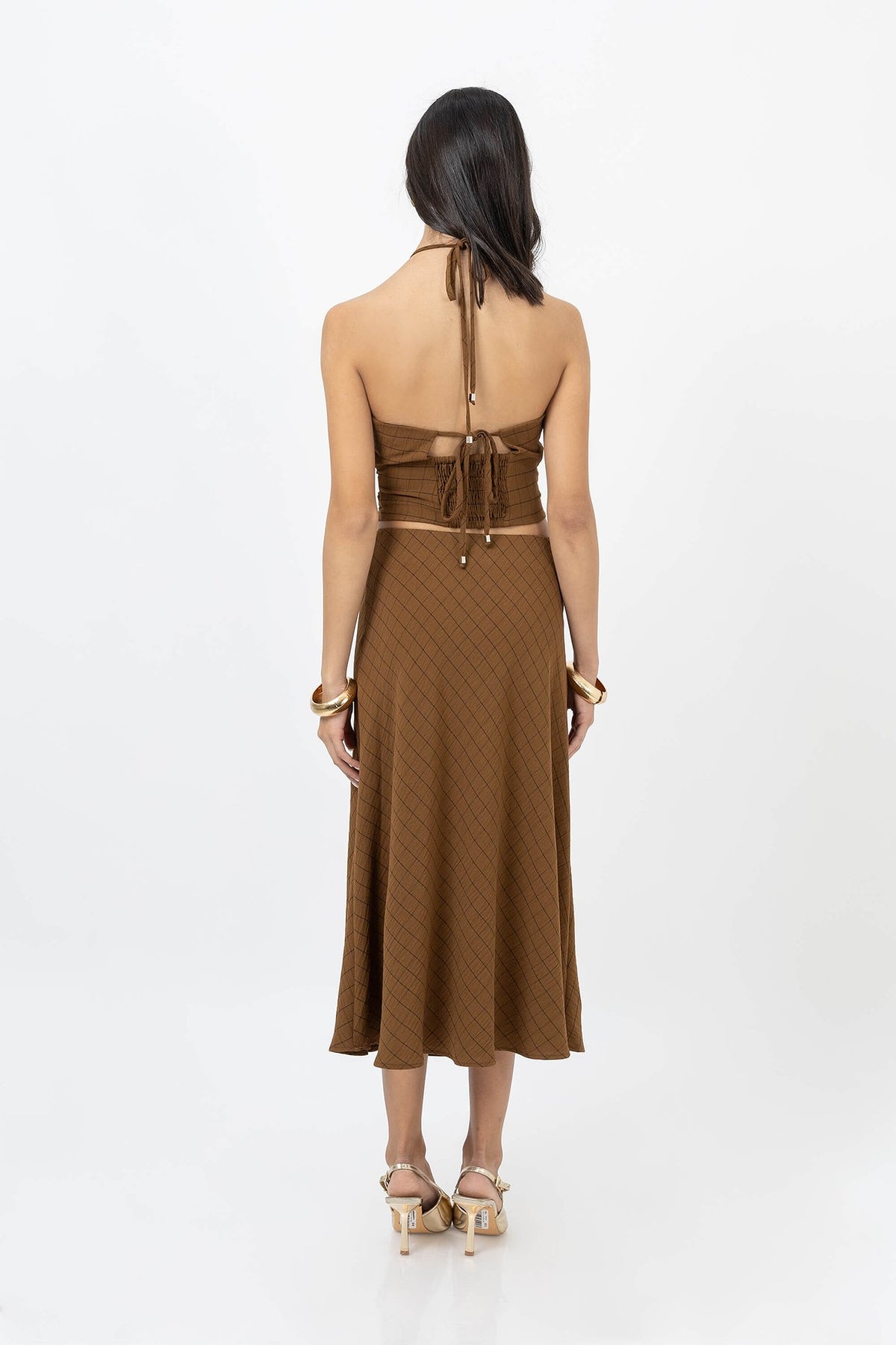 El top halter con cordón y espalda enresortada de Poet Couture es una pieza versátil y moderna. Su diseño ajustado y cuello con detalle metálico realzan el cuello y los hombros, aportando un toque contemporáneo a cualquier look. Ideal para usar con faldas o pantalones de talle alto.