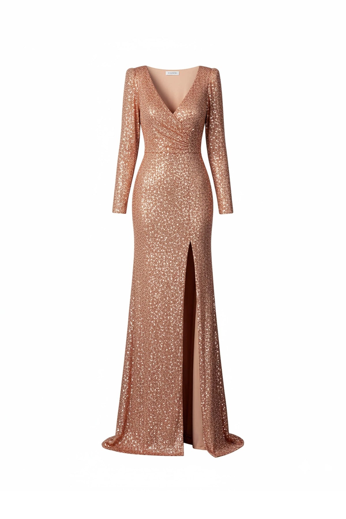 Este vestido largo en tono dorado rosado es la definición de glamour y sofisticación. Cubierto íntegramente con lentejuelas brillantes, crea un efecto de luz cautivador en cada movimiento. Su escote en V y el corte entallado estilizan la silueta, mientras que las mangas largas añaden elegancia y equilibrio al diseño. La abertura lateral en la falda aporta un toque sensual y moderno, ideal para destacar en galas, alfombras rojas o eventos nocturnos. Confeccionado con materiales de alta calidad y un ajuste impecable, es una pieza perfecta para boutiques que buscan ofrecer moda de lujo con alto impacto visual.