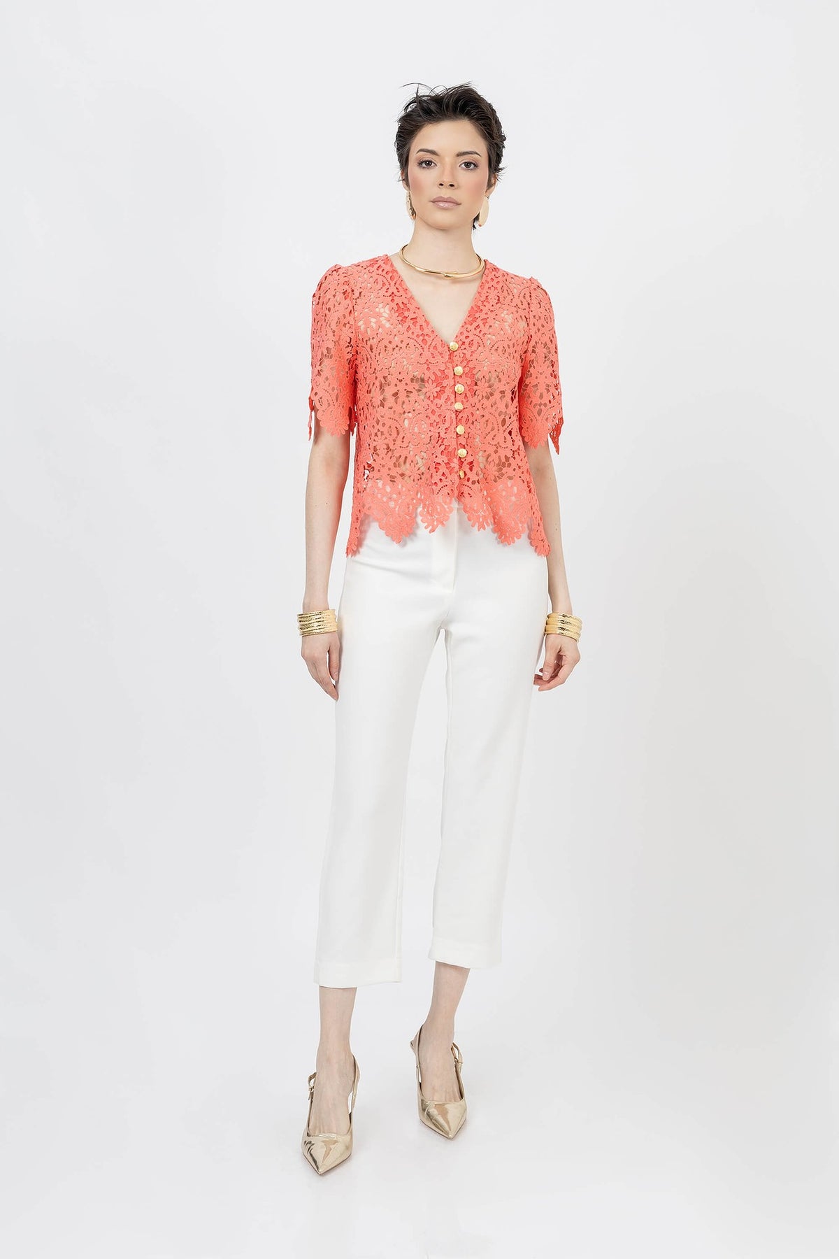 Esta blusa es una pieza maestra de la feminidad contemporánea, confeccionada en un encaje tipo guipur de alta definición con intrincados motivos florales. Su diseño destaca por un elegante cuello en V y una hilera frontal de botones dorados tipo joya que aportan un destello de lujo artesanal. Con mangas cortas de volumen sutil y un ruedo festoneado asimétrico, esta prenda en tono coral vibrante es la elección ideal de la Colección 2026 para eventos de día o para elevar un atuendo casual con una nota de distinción romántica.