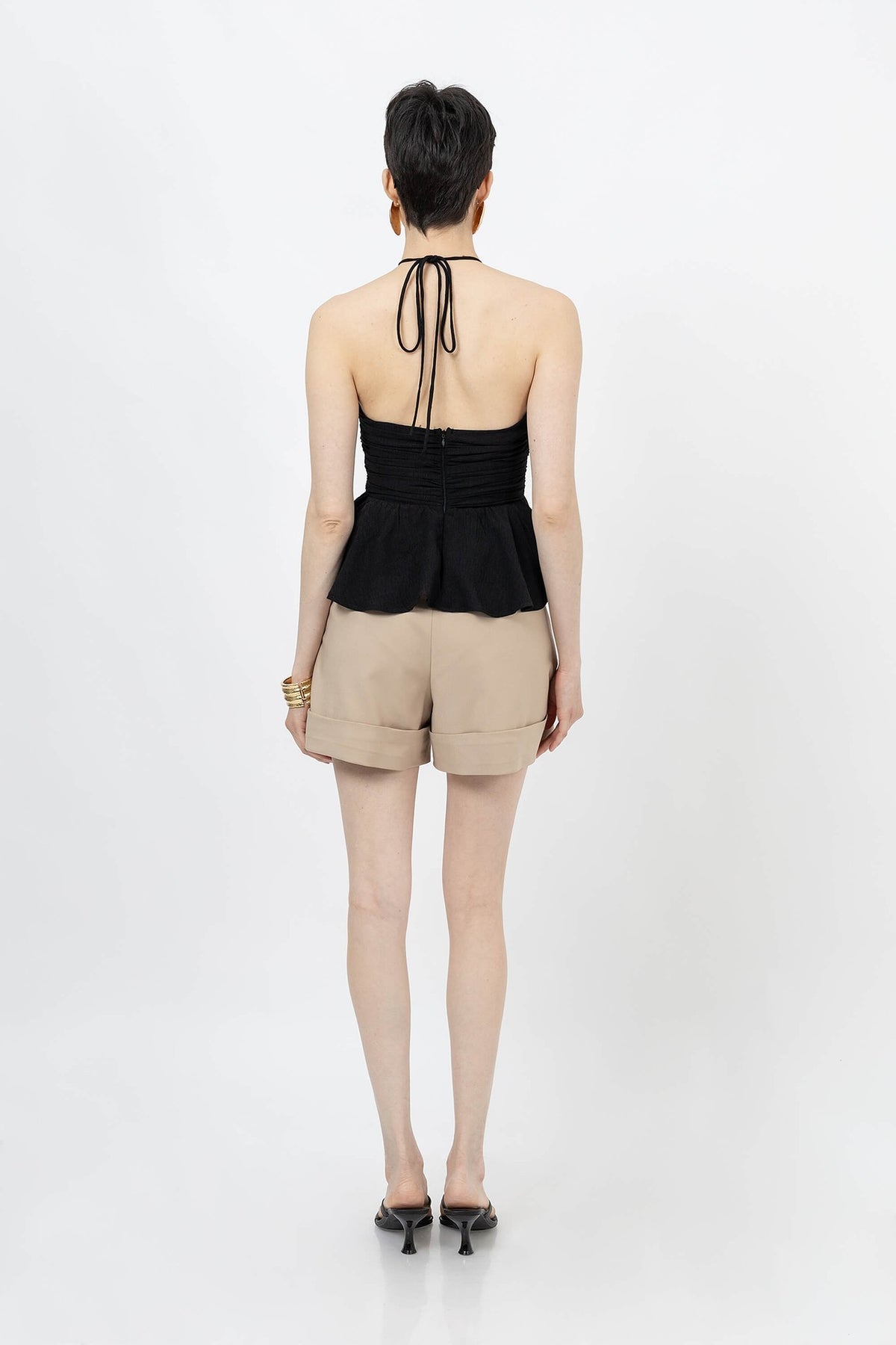 Esta blusa femenina de corte halter es una pieza que combina sensualidad elegante con una construcción cuidadosamente pensada para realzar la silueta. El diseño presenta un delicado fruncido en el área frontal que aporta textura y sofisticación, mientras que el escote halter estiliza los hombros y alarga visualmente el cuello.