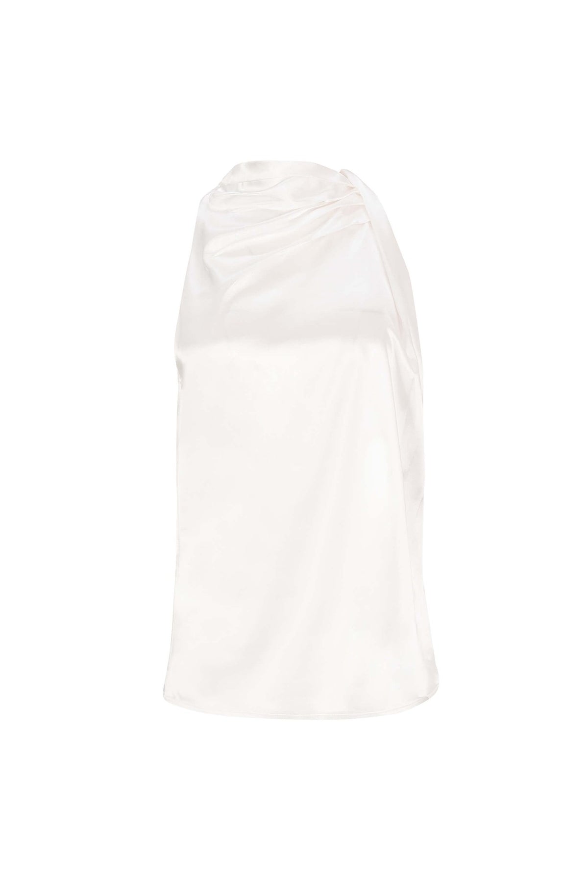 La blusa satinada con drapeado lateral es una pieza sofisticada que captura la esencia del lujo contemporáneo. Su silueta fluida, confeccionada en satín de alto brillo, envuelve el cuerpo con suavidad, aportando movimiento y una textura elegante que refleja la luz con sutileza.