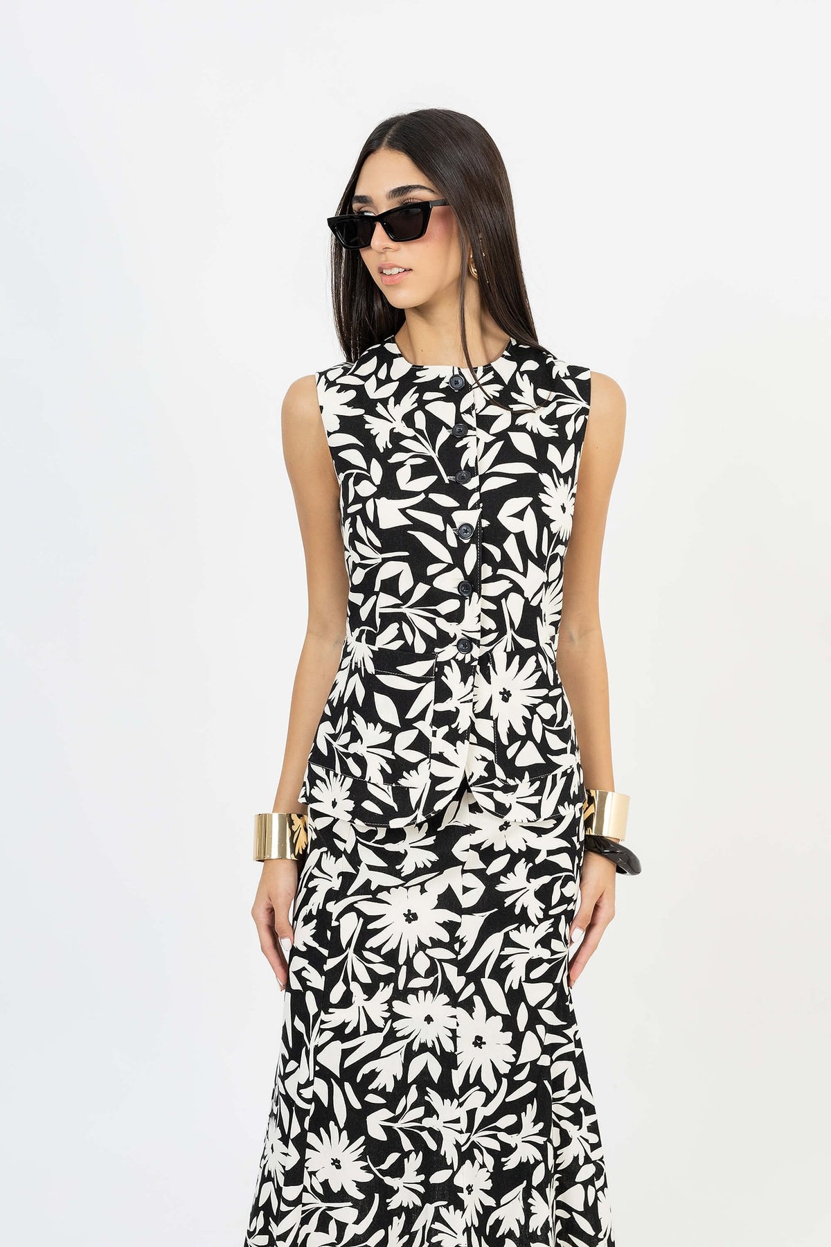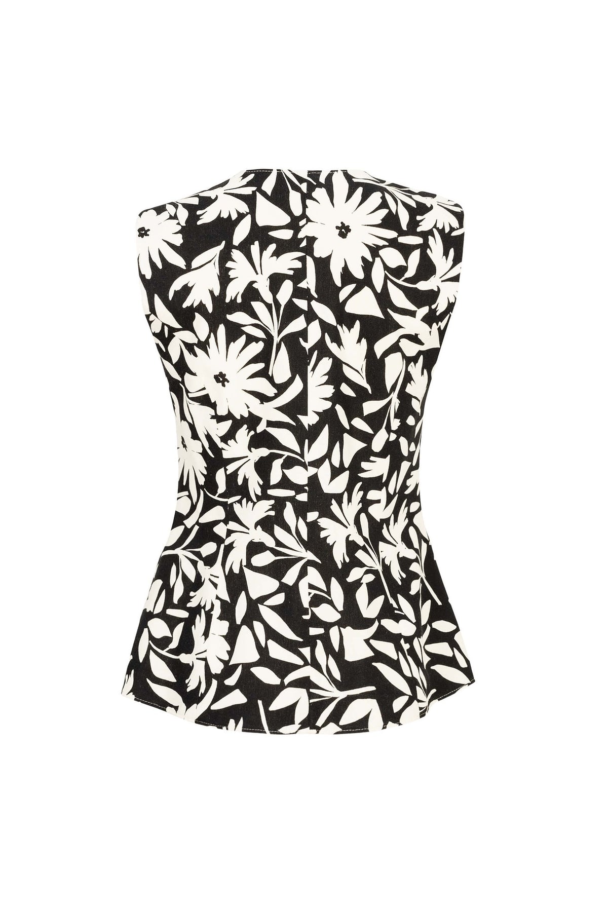 Este chaleco estampado floral sin mangas es una pieza clave para crear looks sofisticados y modernos. Su corte entallado con botonadura frontal estiliza la silueta, ofreciendo un ajuste impecable que combina elegancia y comodidad. Confeccionado en un tejido fresco y ligero, es ideal para lucir en temporadas cálidas o como complemento de outfits más estructurados.