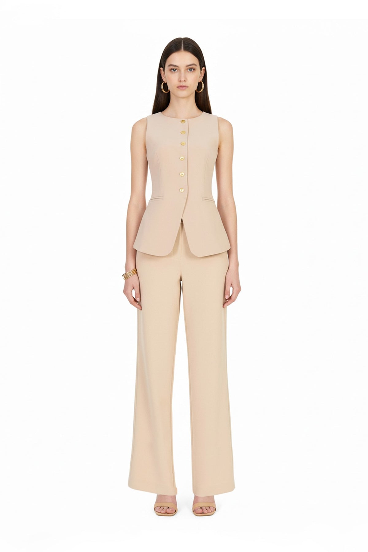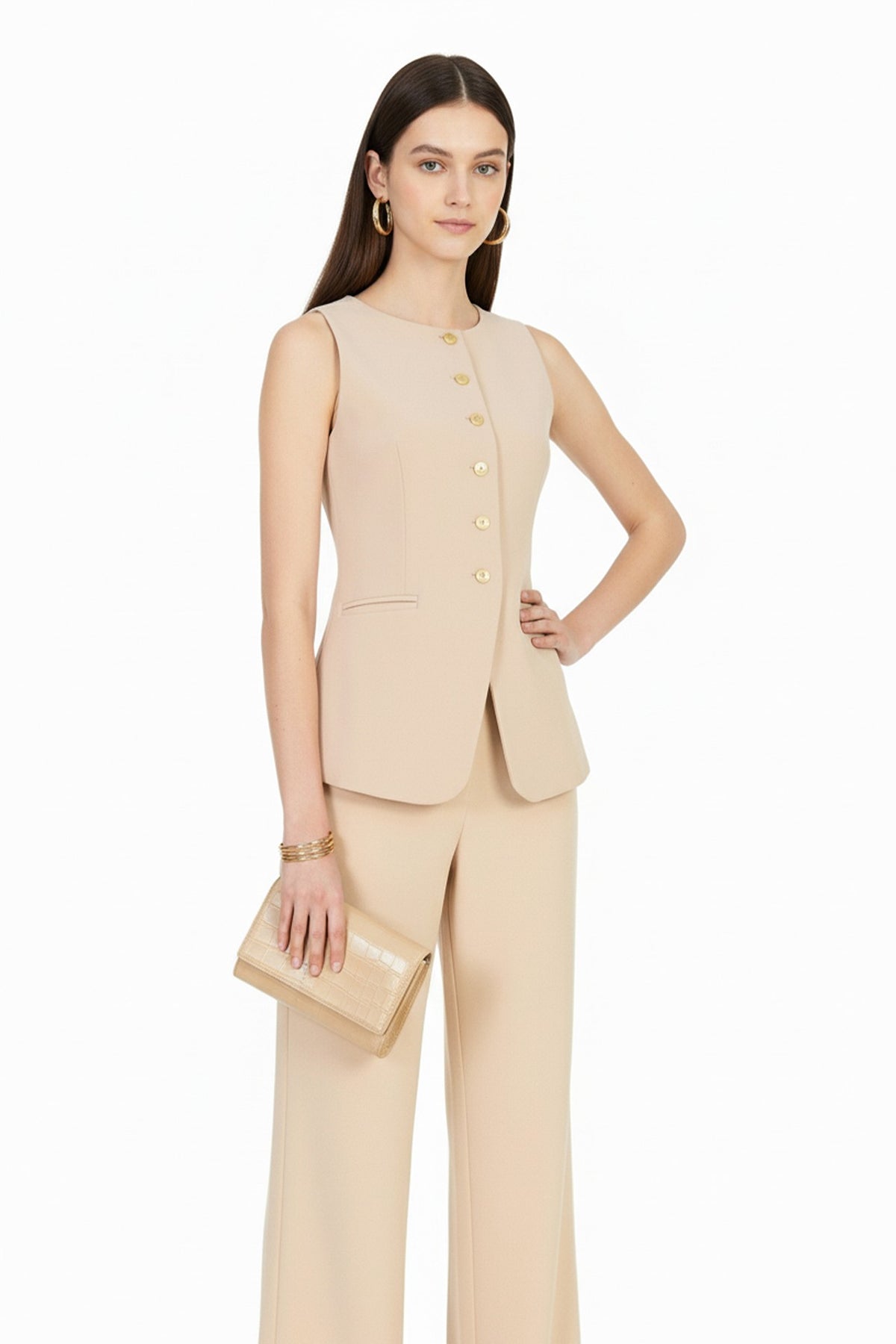 Este chaleco estructurado con botones dorados es una pieza icónica de la elegancia contemporánea. Su diseño sin mangas y silueta entallada realzan la figura con precisión, ofreciendo una apariencia sofisticada y moderna. Los botones dorados al frente aportan un toque de distinción, transformando esta prenda en un símbolo de lujo discreto.
