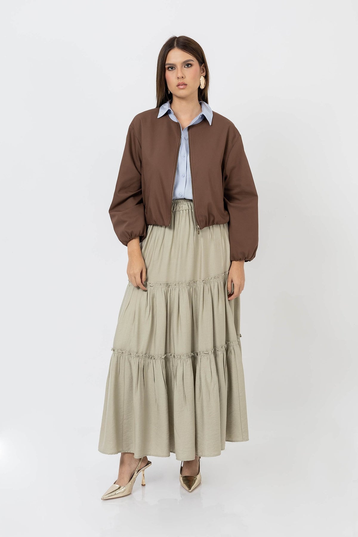 Esta chamarra es una pieza esencial para la mujer que busca proyectar una presencia segura, moderna y sofisticada. Su diseño limpio y estructurado realza la silueta de manera sutil, brindando un equilibrio perfecto entre comodidad y elegancia. El cierre frontal aporta practicidad sin perder ese toque de lujo contemporáneo que distingue a la marca, mientras que los puños suaves ayudan a crear un volumen delicado y femenino.