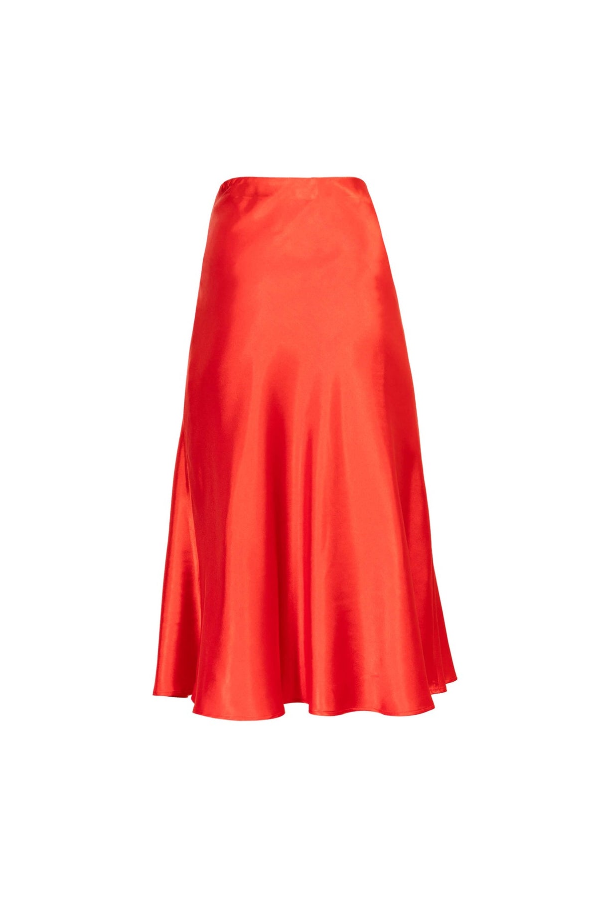 Falda satinada midi de diseño elegante y sofisticado, confeccionada en un tejido ligero con acabado brillante que aporta movimiento y un efecto lujoso a cada paso. Su corte en línea A estiliza la silueta, mientras que su caída fluida la convierte en una prenda versátil y atemporal.