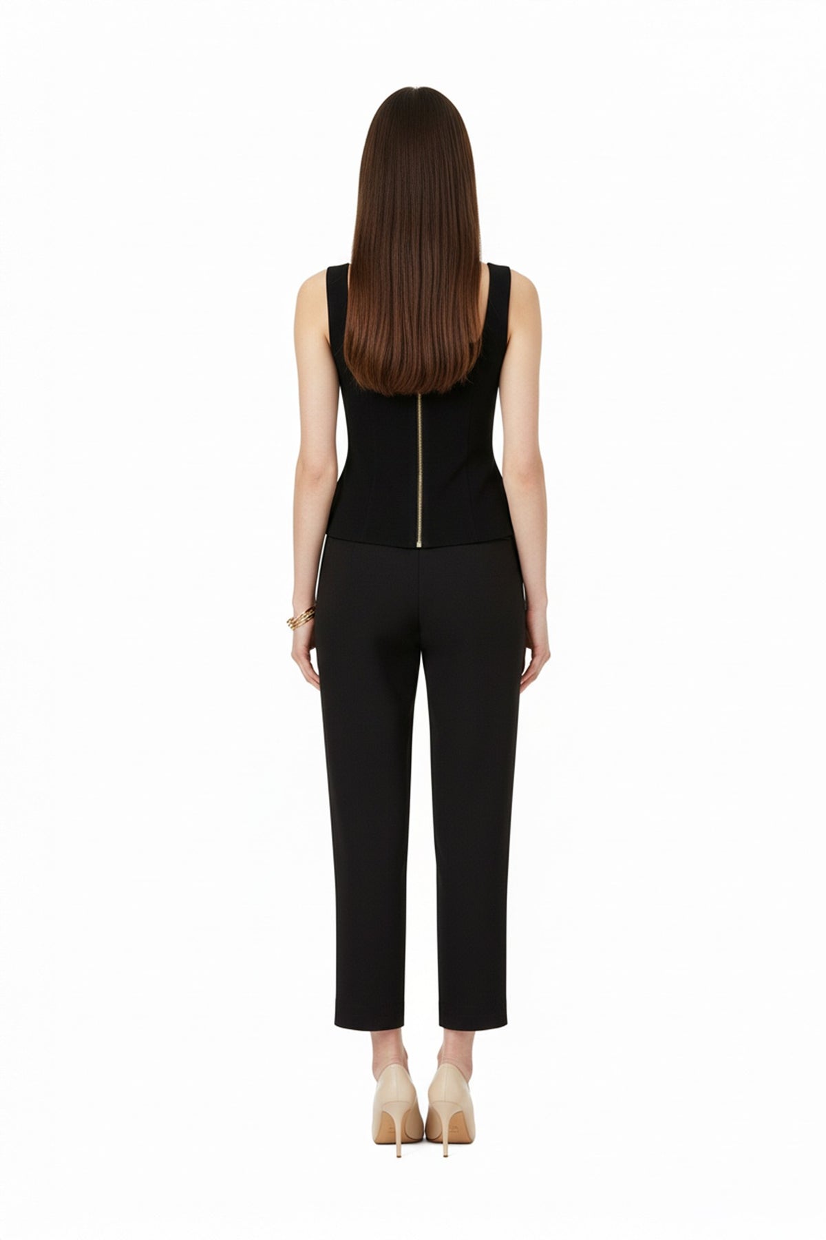 Perfecto para combinar con chalecos, blusas de seda o blazers, este pantalón se adapta con facilidad tanto a ambientes ejecutivos como a eventos de noche. El diseño minimalista resalta por su versatilidad, ofreciendo una base impecable para looks refinados y modernos.