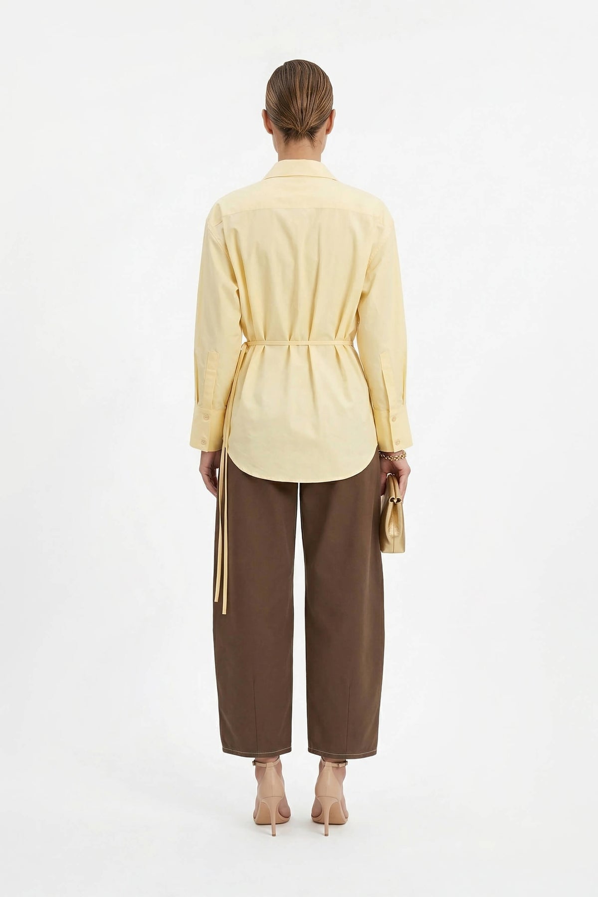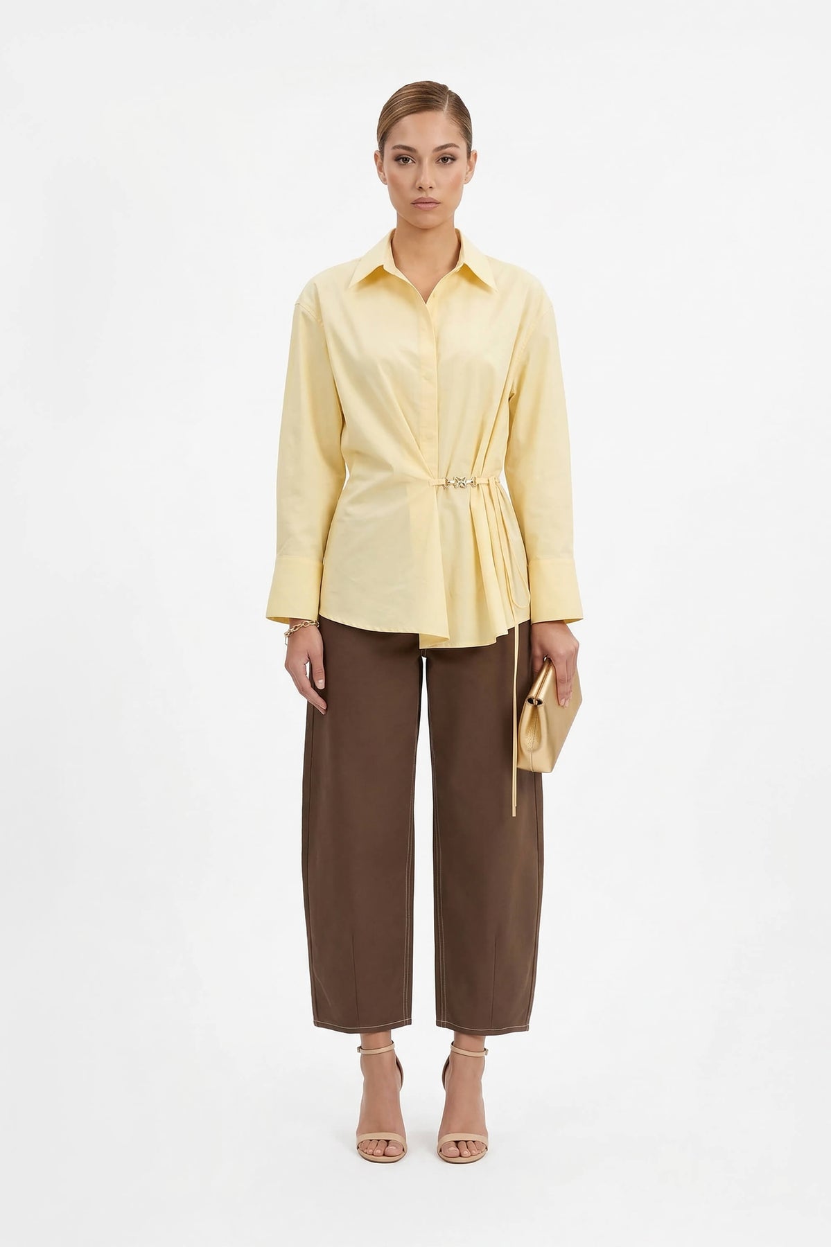 Este pantalón de corte wide leg en tono café chocolate es la pieza esencial para el guardarropa de la mujer contemporánea que busca comodidad sin sacrificar el estilo. Su diseño se distingue por un pespunteado que genera un contraste que delinea las bolsas, la pretina y el bajo, aportando una estética moderna y estructurada de inspiración workwear refinada. Con un tiro alto que estiliza la figura y una caída amplia y recta, esta prenda es ideal para crear looks versátiles, desde un estilo casual con calzado plano hasta uno más sofisticado con tacones.
