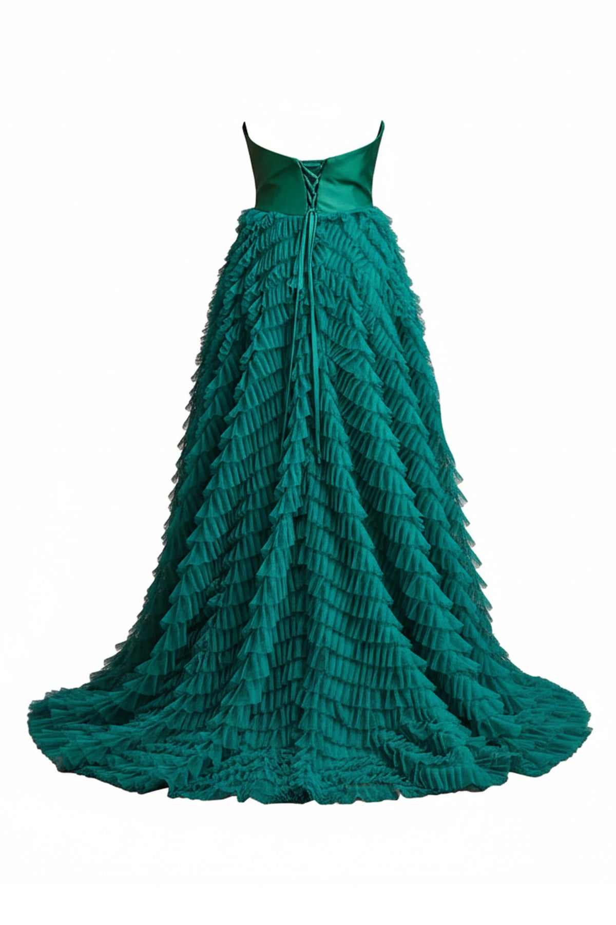 Este vestido de gala en color verde es una obra maestra de elegancia y sofisticación. Su diseño strapless realza el escote y aporta un aire moderno y sensual, mientras que la falda amplia con olanes en cascada crea un movimiento dramático y lleno de personalidad. La abertura frontal añade un detalle seductor y estiliza la silueta, convirtiéndolo en una pieza ideal para galas, alfombras rojas, bodas o celebraciones de alto nivel. La espalda descubierta con lazada ajustable completa el look con un toque refinado y exclusivo.