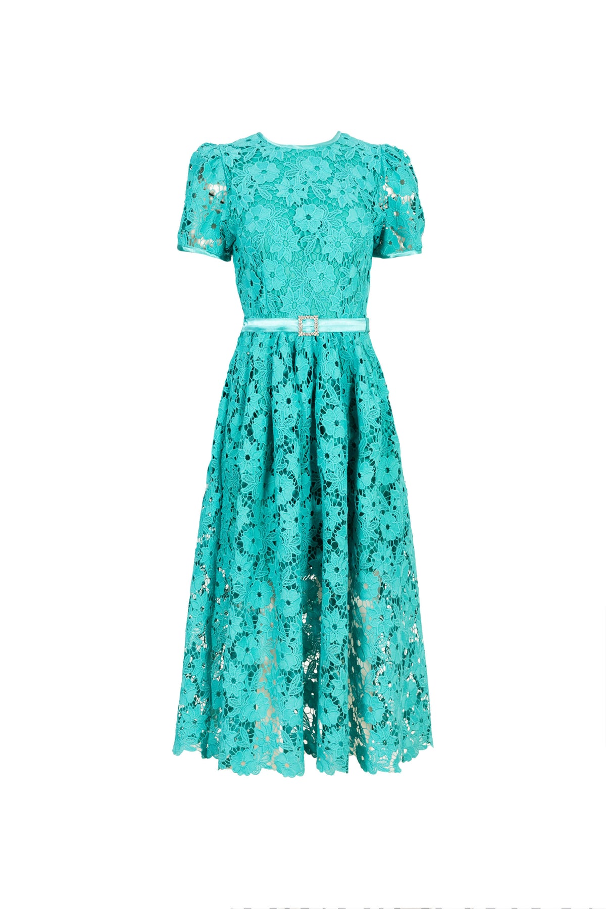 Este encantador vestido midi jade redefine el romance moderno con su intrincado patrón de encaje floral. Presenta una silueta clásica y favorecedora con cuello redondo, mangas cortas ligeramente abullonadas y una falda acampanada que fluye con elegancia. La cintura está realzada por un fino cinturón de raso a juego, rematado con una deslumbrante hebilla de pedrería que añade un toque de glamour sofisticado. El encaje translúcido revela sutilmente el forro en tono nude, creando un contraste visual sofisticado y etéreo. Es la pieza ideal para bodas de día, eventos de cóctel o celebraciones que requieren un look femenino y distinguido.