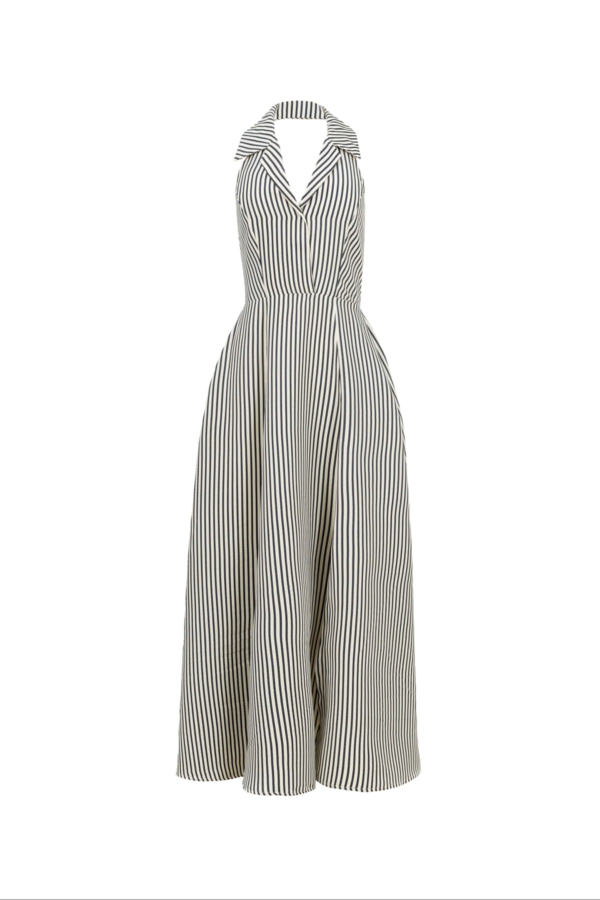 Este impresionante vestido maxi es la definición de la elegancia arquitectónica para eventos de gala. Su diseño halter se distingue por un sofisticado cuello tipo camisa que realza el busto y los hombros con audacia. La magia de la pieza reside en su espalda, donde un sistema de lazos anchos y estructurados crea un impacto visual dramático y permite un ajuste personalizado. Confeccionado con un tejido firme que mantiene el volumen, la falda A-line cae con un vuelo majestuoso, convirtiéndolo en la elección perfecta para la mujer moderna que busca destacar con distinción.