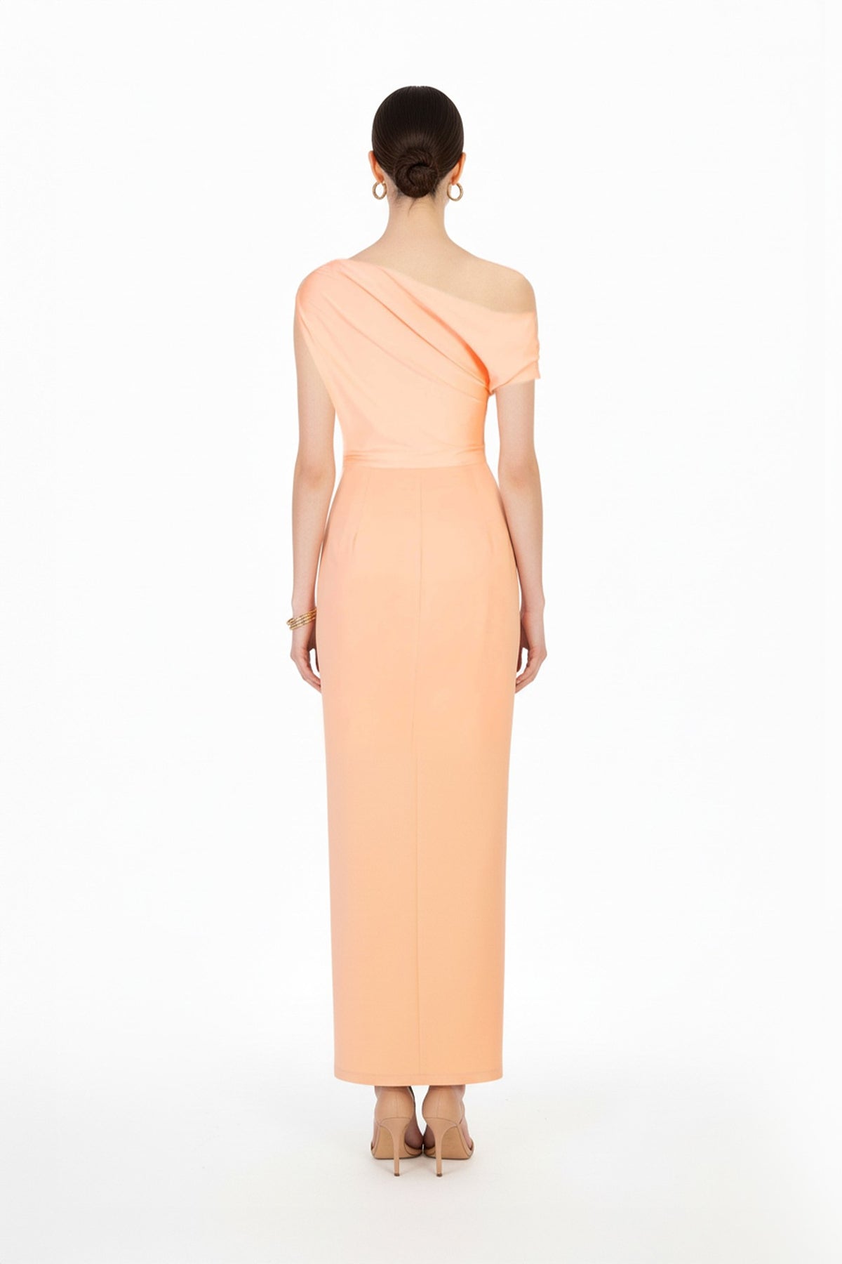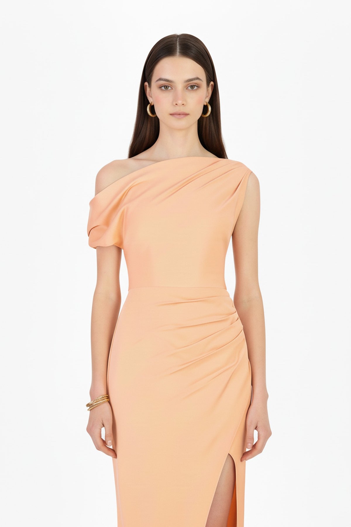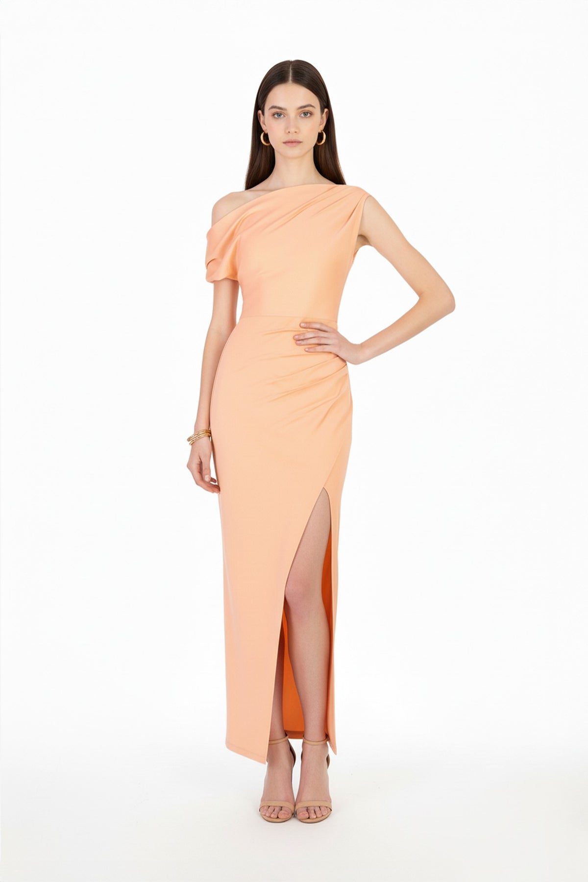 Este vestido asimétrico es una pieza de lujo diseñada para realzar la silueta con elegancia y modernidad. Su escote de un solo hombro aporta un aire sofisticado y vanguardista, mientras que el drapeado lateral estiliza la figura de forma delicada y favorecedora. La abertura lateral añade un toque audaz y refinado, perfecto para destacar en eventos de gala, cocteles o celebraciones exclusivas.