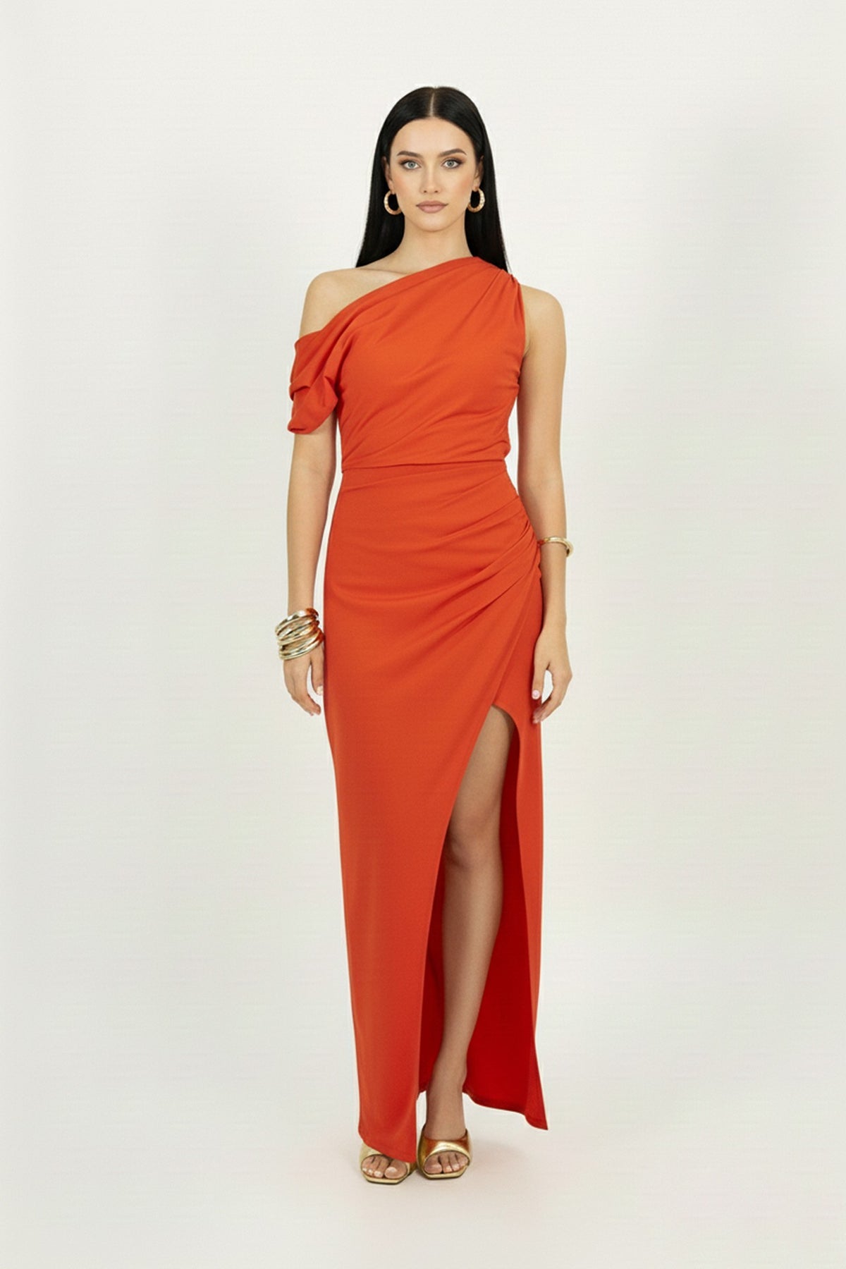 Este vestido asimétrico es una pieza de lujo diseñada para realzar la silueta con elegancia y modernidad. Su escote de un solo hombro aporta un aire sofisticado y vanguardista, mientras que el drapeado lateral estiliza la figura de forma delicada y favorecedora. La abertura lateral añade un toque audaz y refinado, perfecto para destacar en eventos de gala, cocteles o celebraciones exclusivas.
