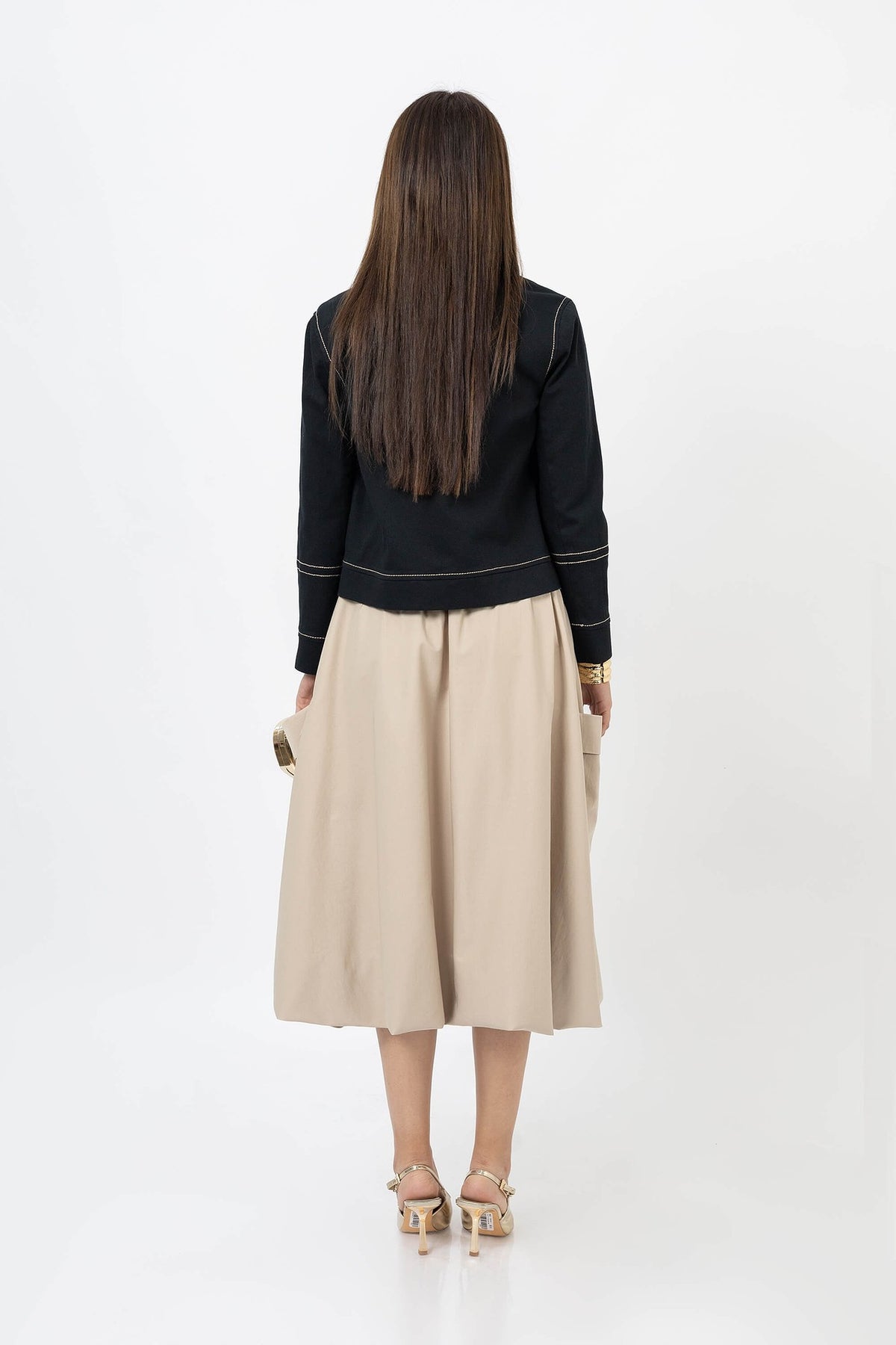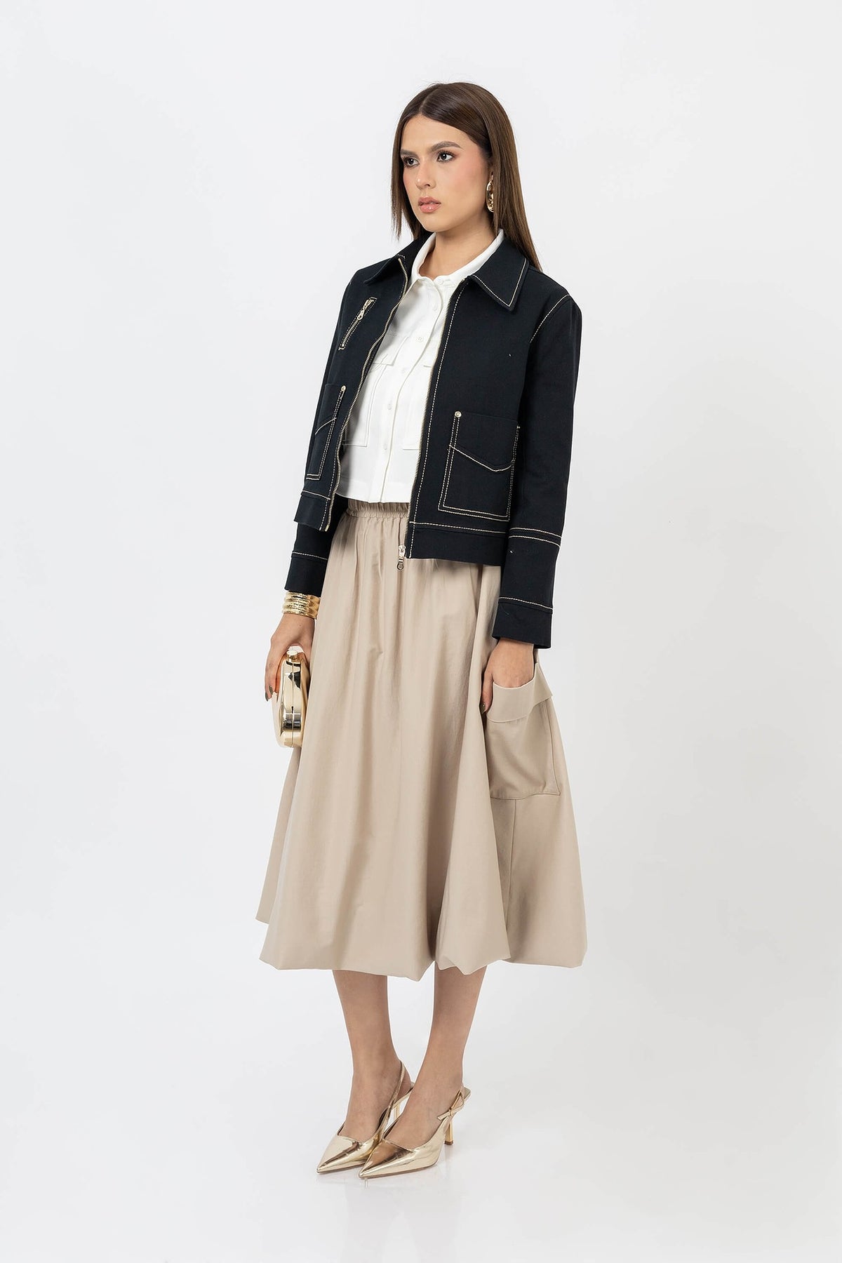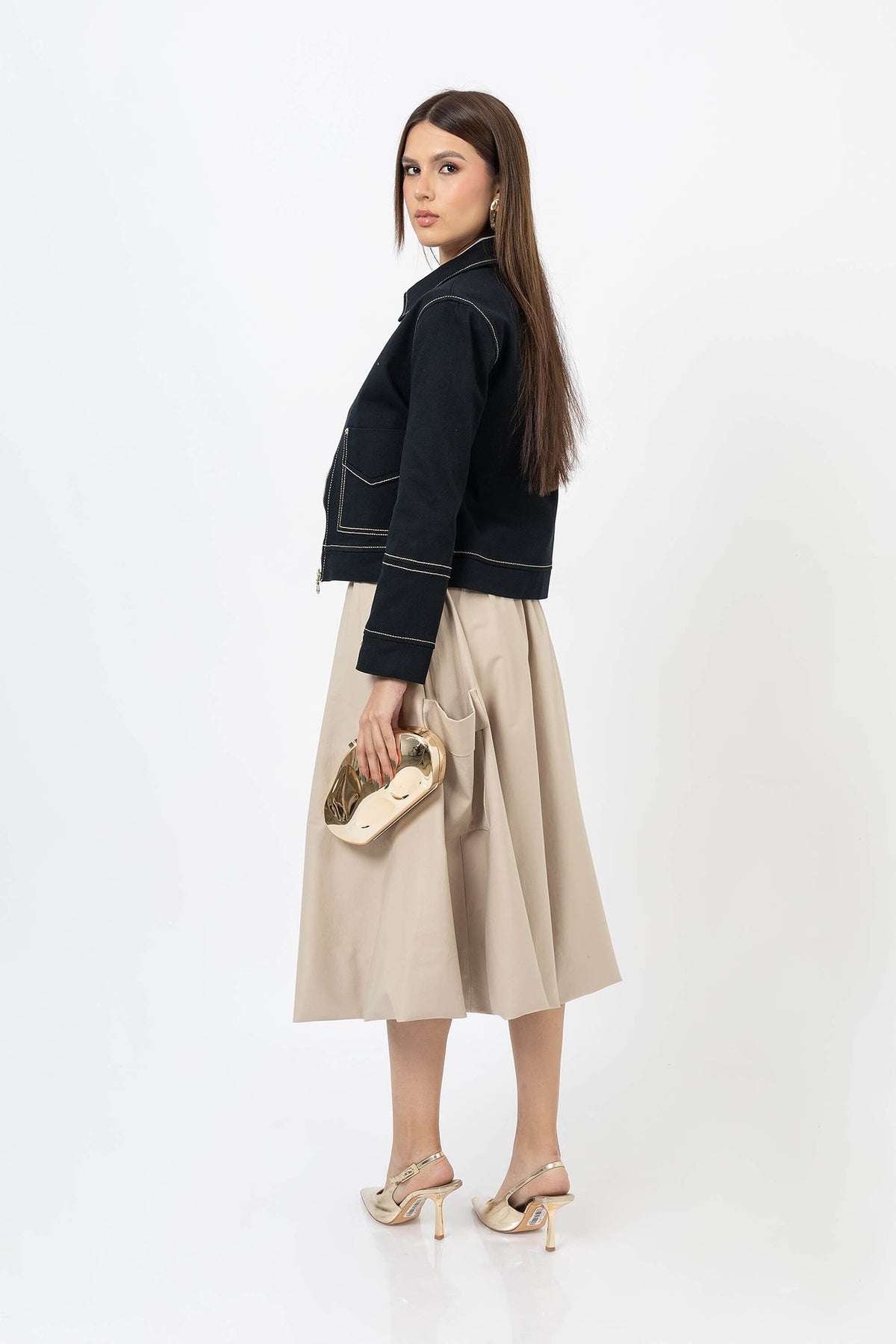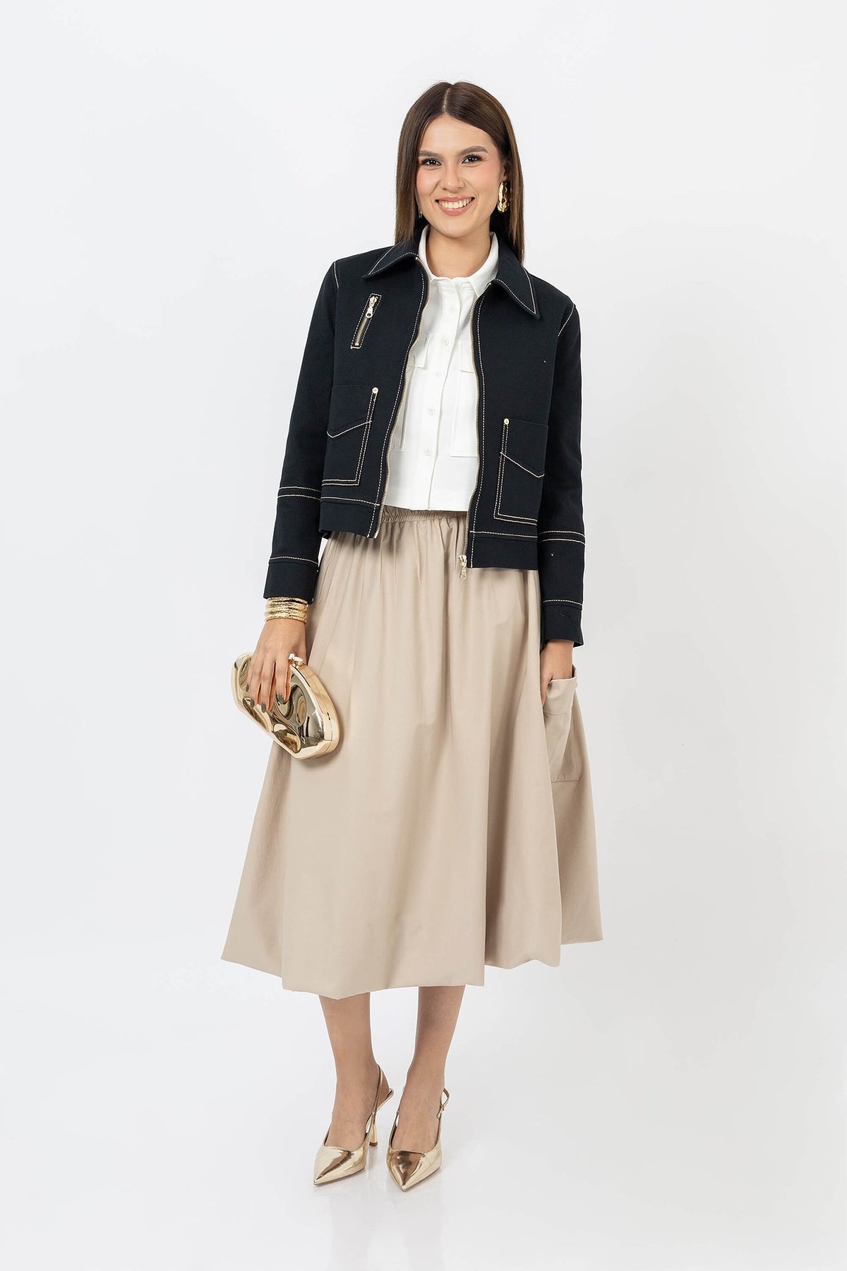 Esta chamarra es una pieza pensada para mujeres que buscan prendas con carácter, presencia y un acabado impecable. Su diseño estructurado y los detalles de costuras visibles crean un contraste sutil que acentúa la silueta y aporta un aire contemporáneo. El corte recto y la longitud a la cadera la hacen ideal para equilibrar proporciones, mientras que los bolsillos frontales aportan funcionalidad sin renunciar a la sofisticación.